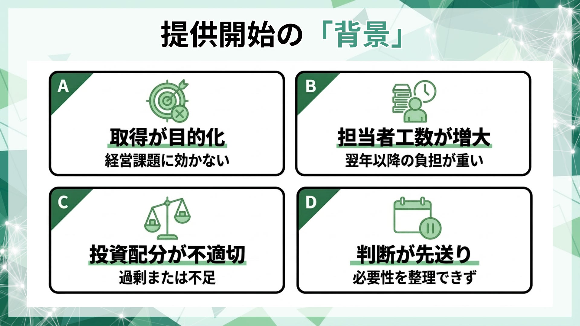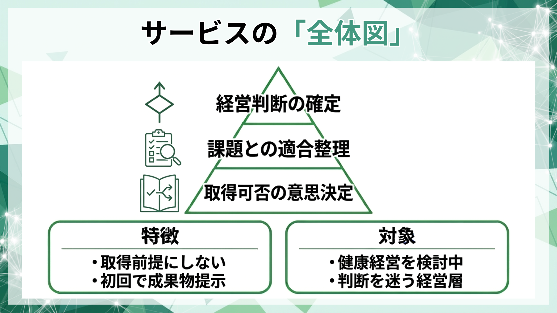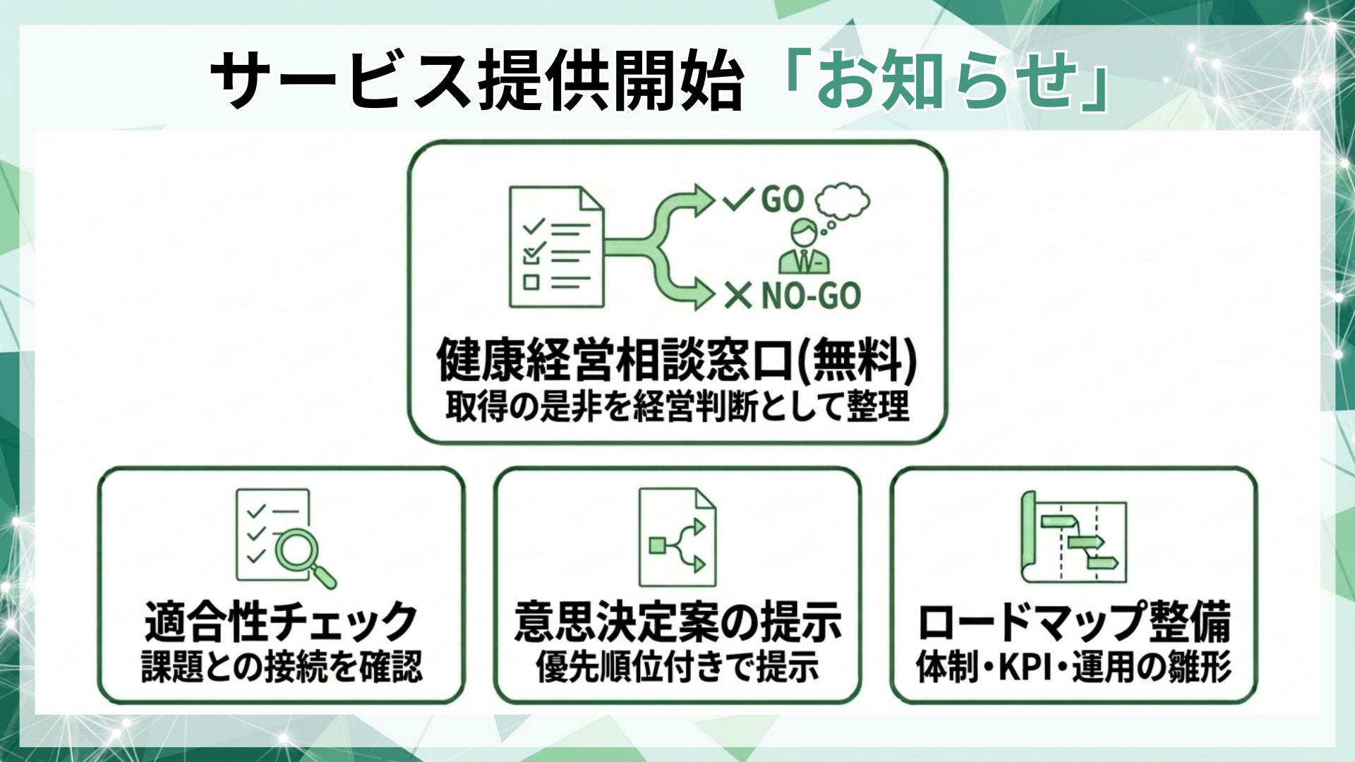 本サービスは、健康経営を「やる/やらない」を勘で決めず、制度目的と社会背景、自社の経営課題の適合で整理し、意思決定の材料を短時間で揃えることを目的とします。