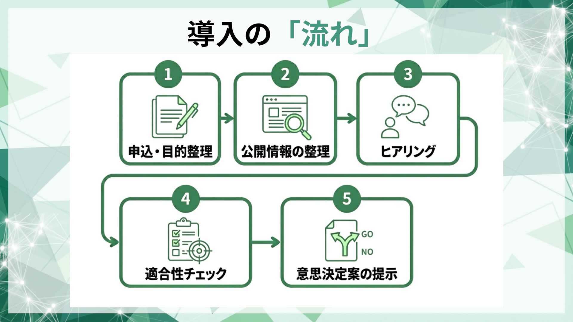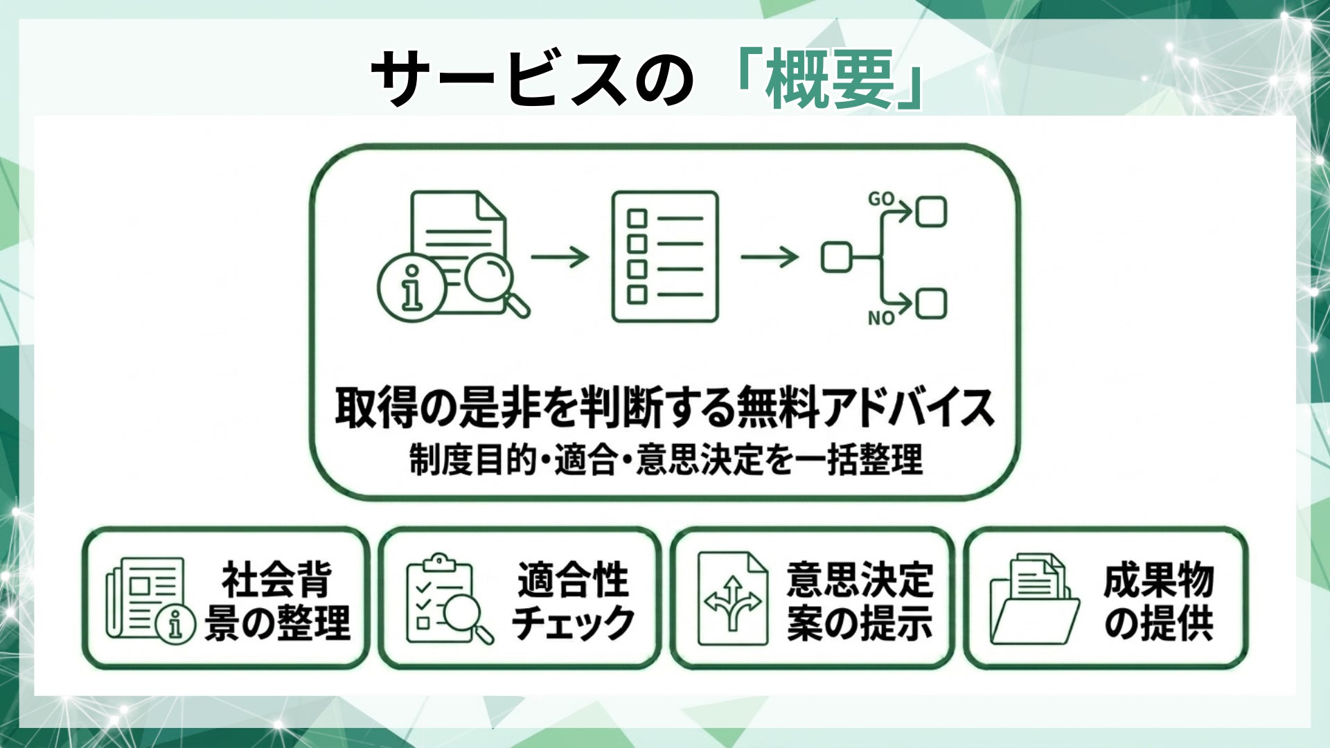 情報収集の段階でも利用でき、初回で取得適合性チェックと意思決定のたたき台を提示します。下記窓口までお問い合わせください。