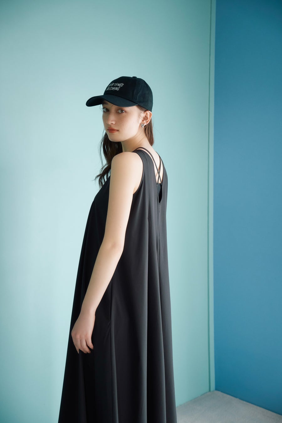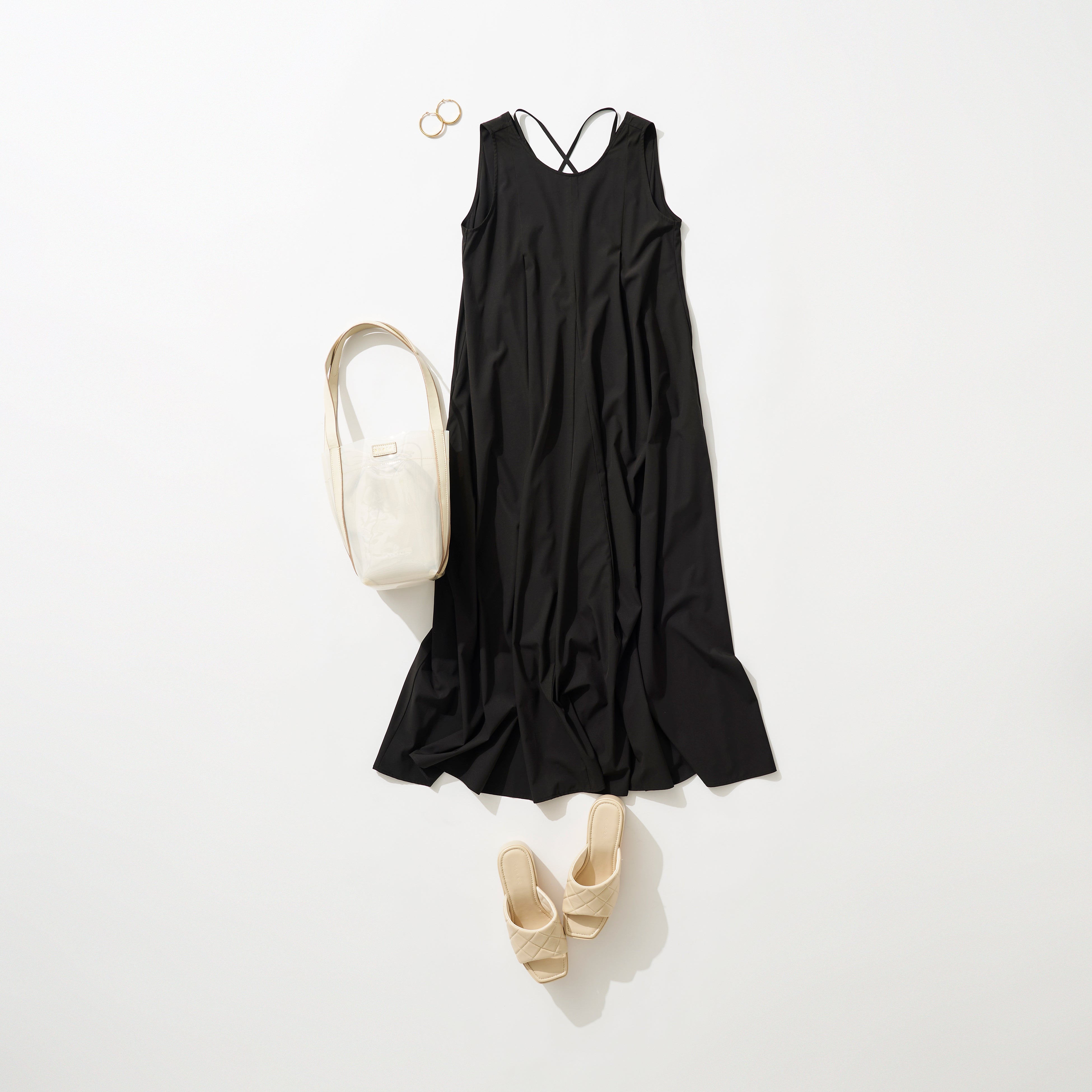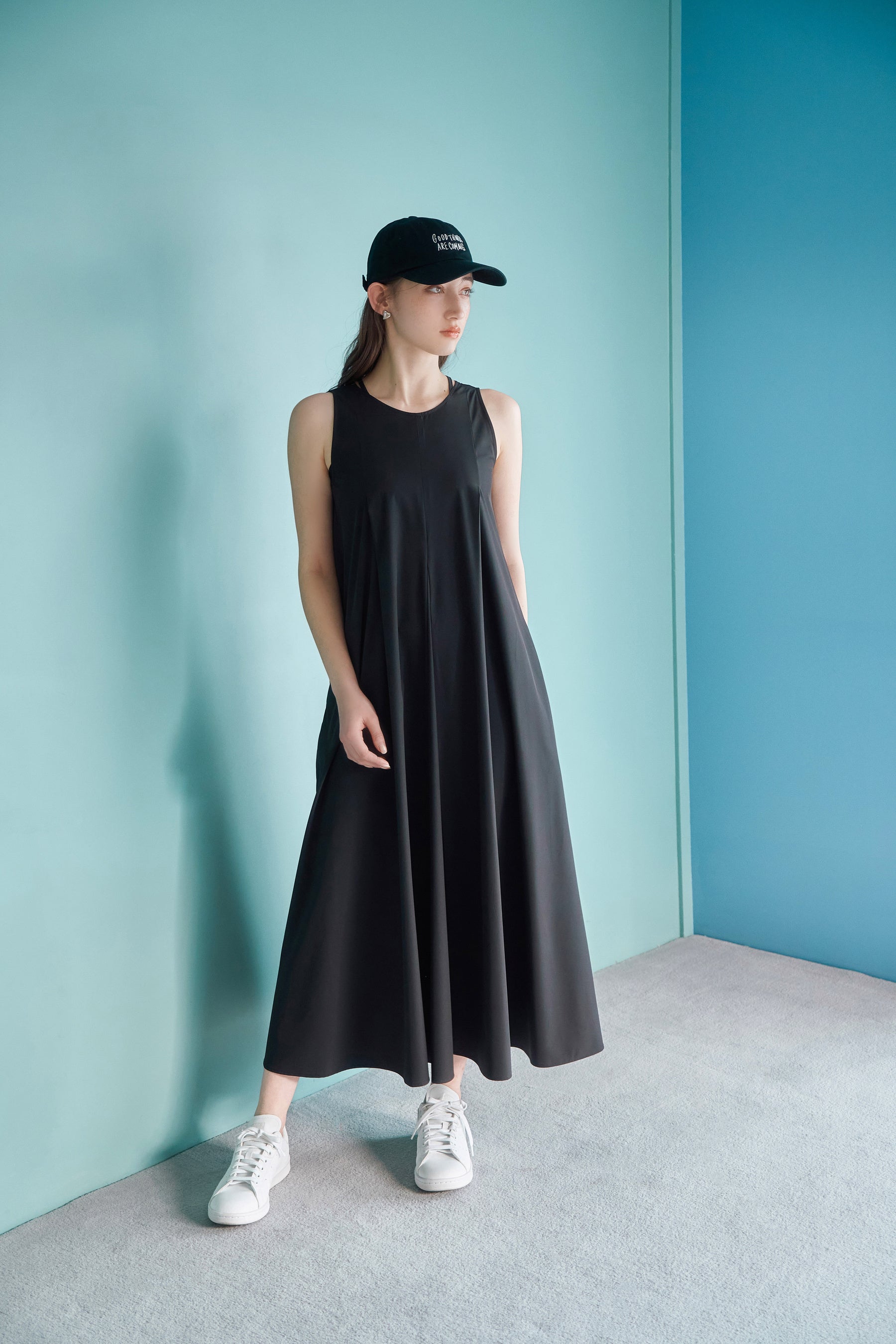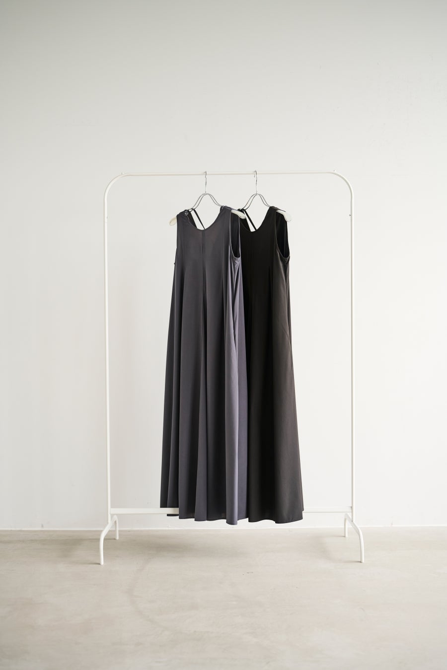 軽やかなフレアシルエットとアメリカンスリーブでシンプルに仕立てたAラインワンピース。