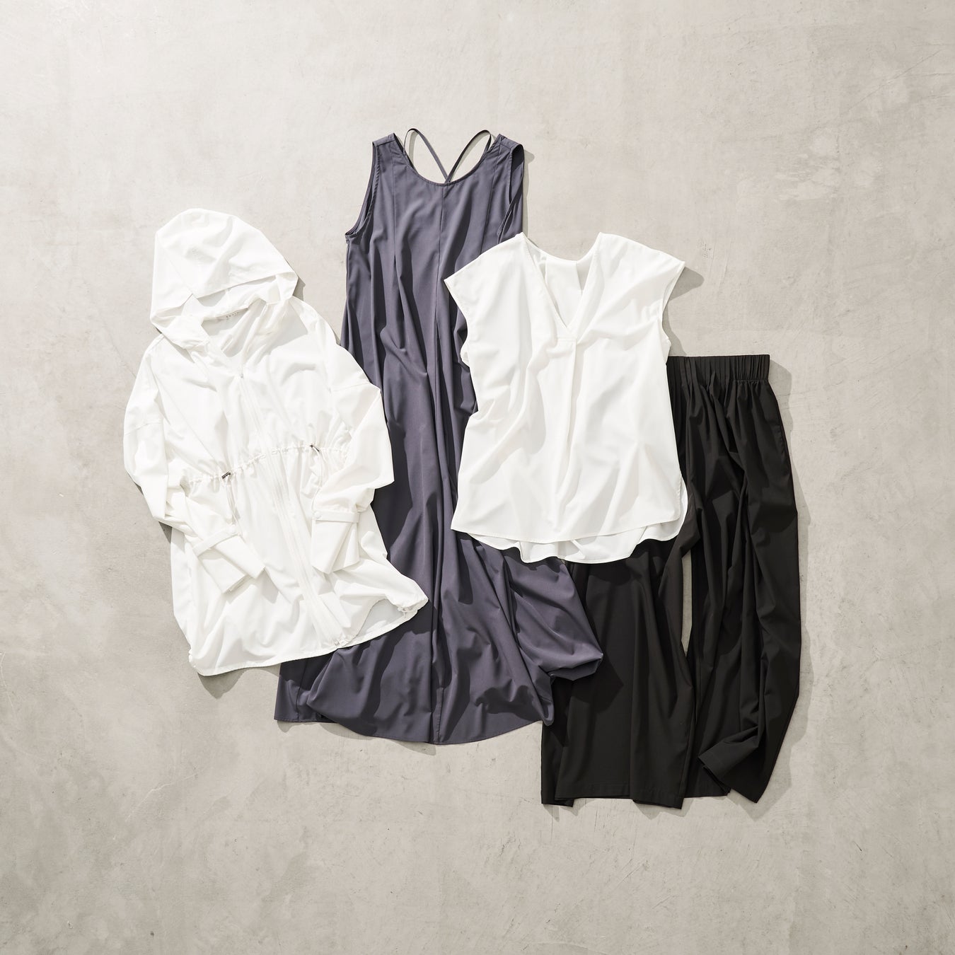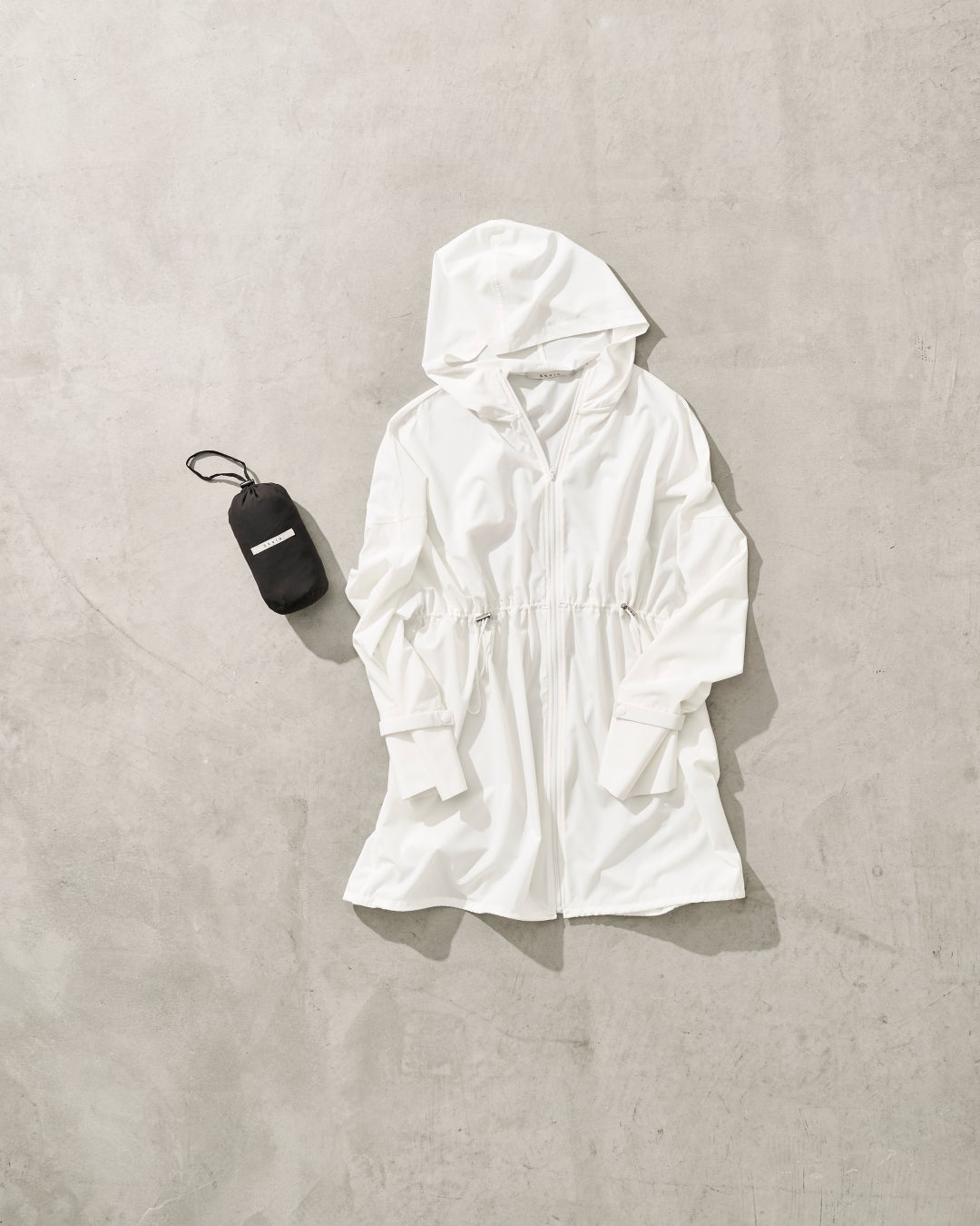 素材はポリウレタンを15%以上含むストレッチ性の高いポリエステル生地に、撥水・UVカット機能を搭載しています。ソフトでさらりとした風合いと、まるで着ていないかのような“薄軽”な着用感。洗濯機洗いOKで、シワになりにくいのも特徴です。