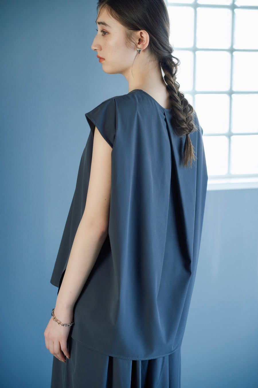 背中のタックディテールが特徴のブラウスと、つまみ出しタックで生地を浮かせたワイドパンツのセットアップ企画。ゆったりと肌から離れるシルエットで通気性も良く、暑い日も快適な着心地です。