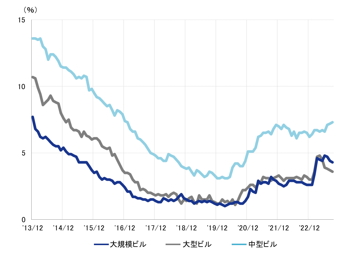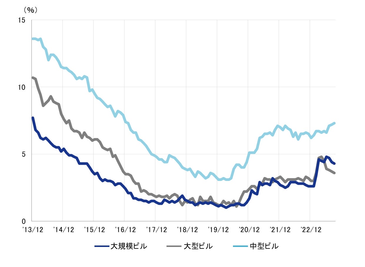 規模別 空室率:「大型」5ヵ月連続で低下し、3%台半ばへ