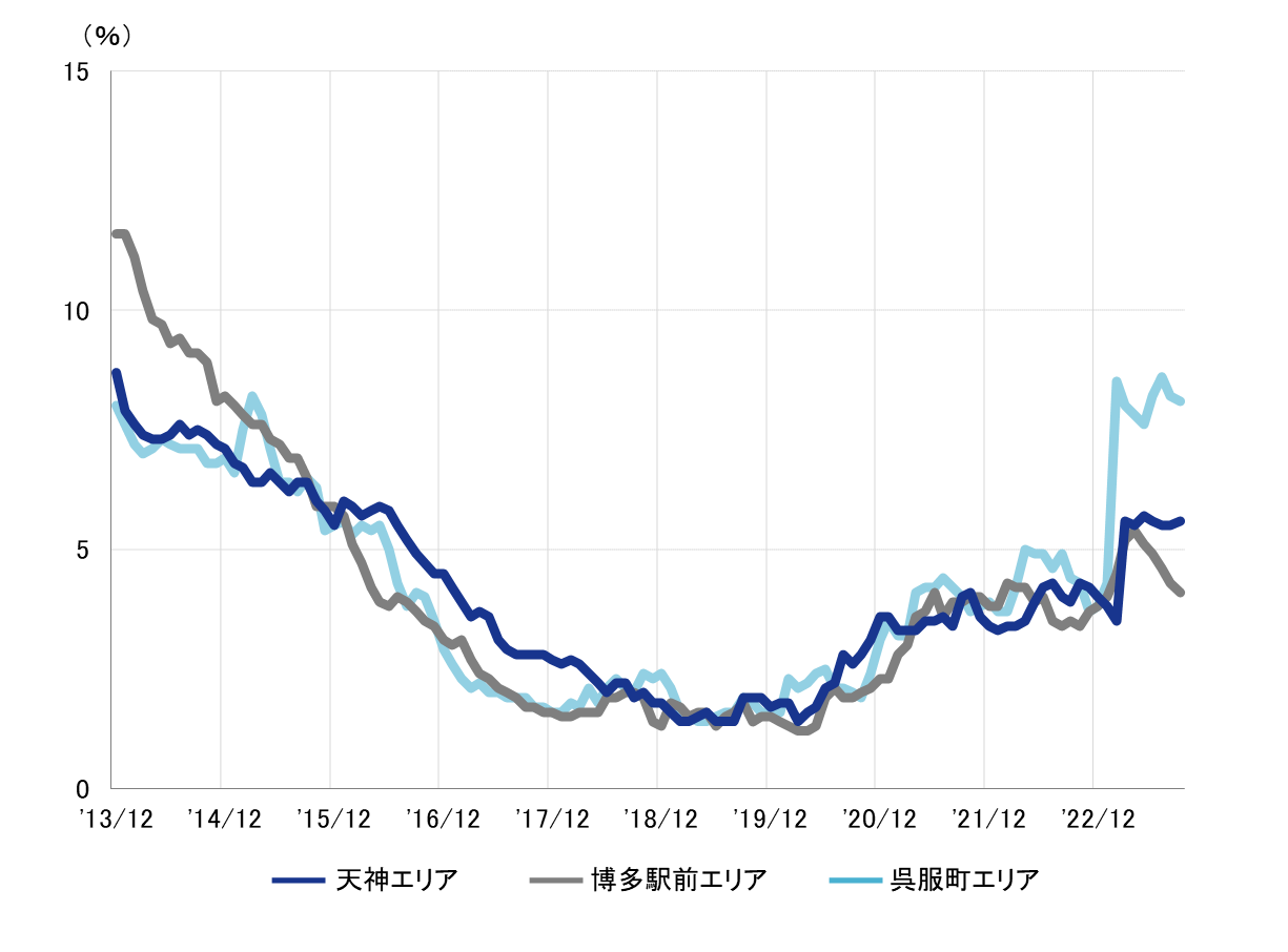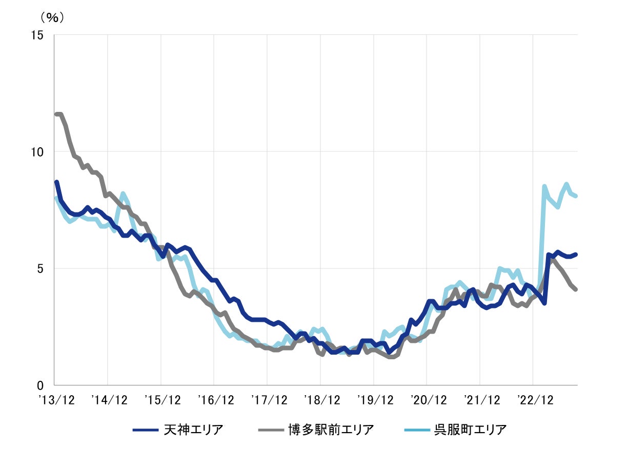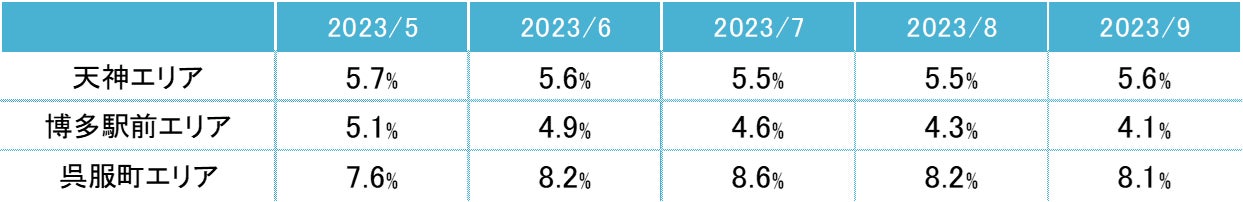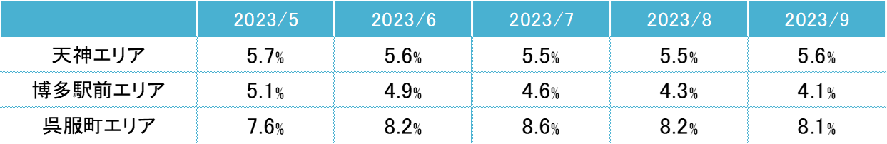 全規模ビル 主要エリア 空室率:「博多駅前」5ヵ月連続で低下し、3%台目前に