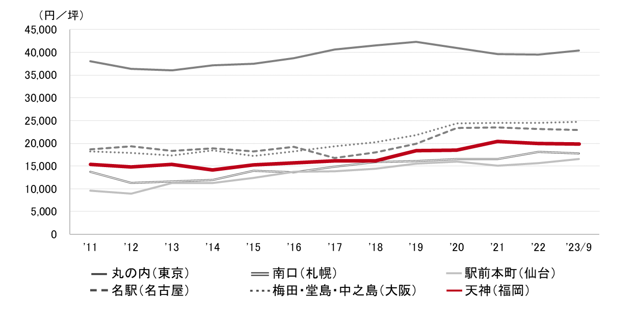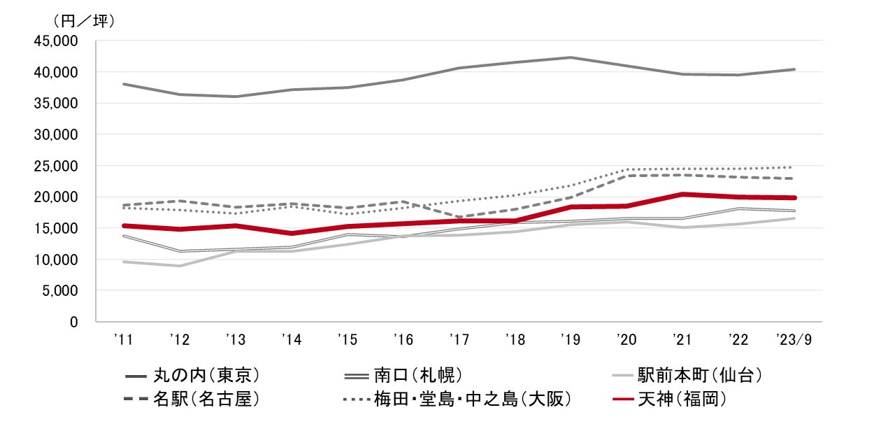 <募集賃料の推移(6大都市 大規模ビル・主要駅前地区)>