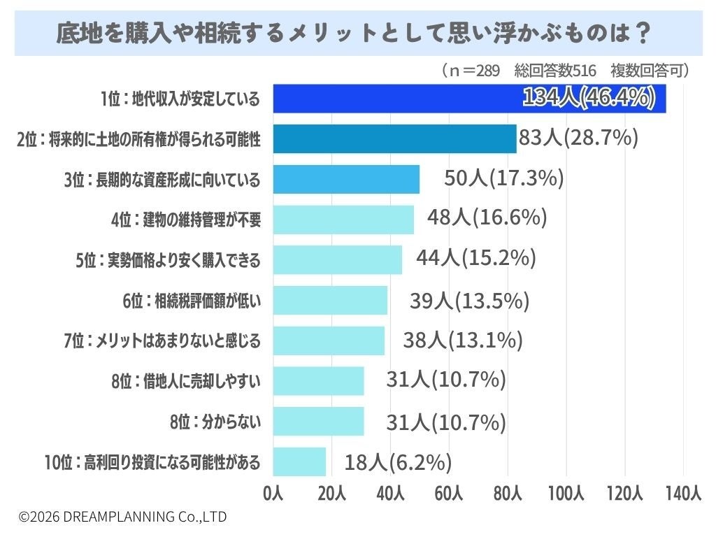 そこで今回、株式会社ドリームプランニング(神奈川県横浜市中区/代表取締役:髙橋樹人)が運営する不動産のお悩み解決サイト負動産買取センターが、不動産に興味関心を持つ方(有効回答数:289名)を対象に底地を取得するメリットについてどう考えていらっしゃるか、アンケート調査を実施しました。