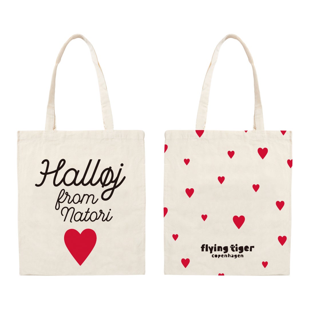 Flying Tiger Copenhagenでは、各店限定の『ストアリミテッドバッグ』を販売しています。〈イオンモール名取ストア〉では、デンマークの人たちが大好きなモチーフ”ハート”と、メッセージ“Halløj from Natori” (デンマーク語で「名取からこんにちは!」)を配したバッグを展開。4/18(金)のオープン日、先着100名様に、この『ストアリミテッドバッグ』をプレゼントします。