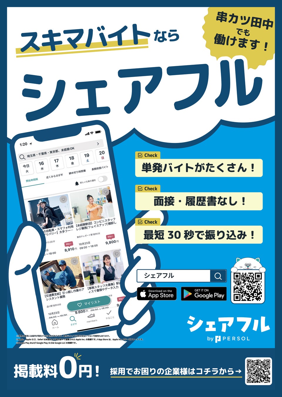 スキマバイトアプリ『シェアフル』、昨年に引き続き新たに「串カツ田中」2店舗とKTリーグのスポンサー契約を締結