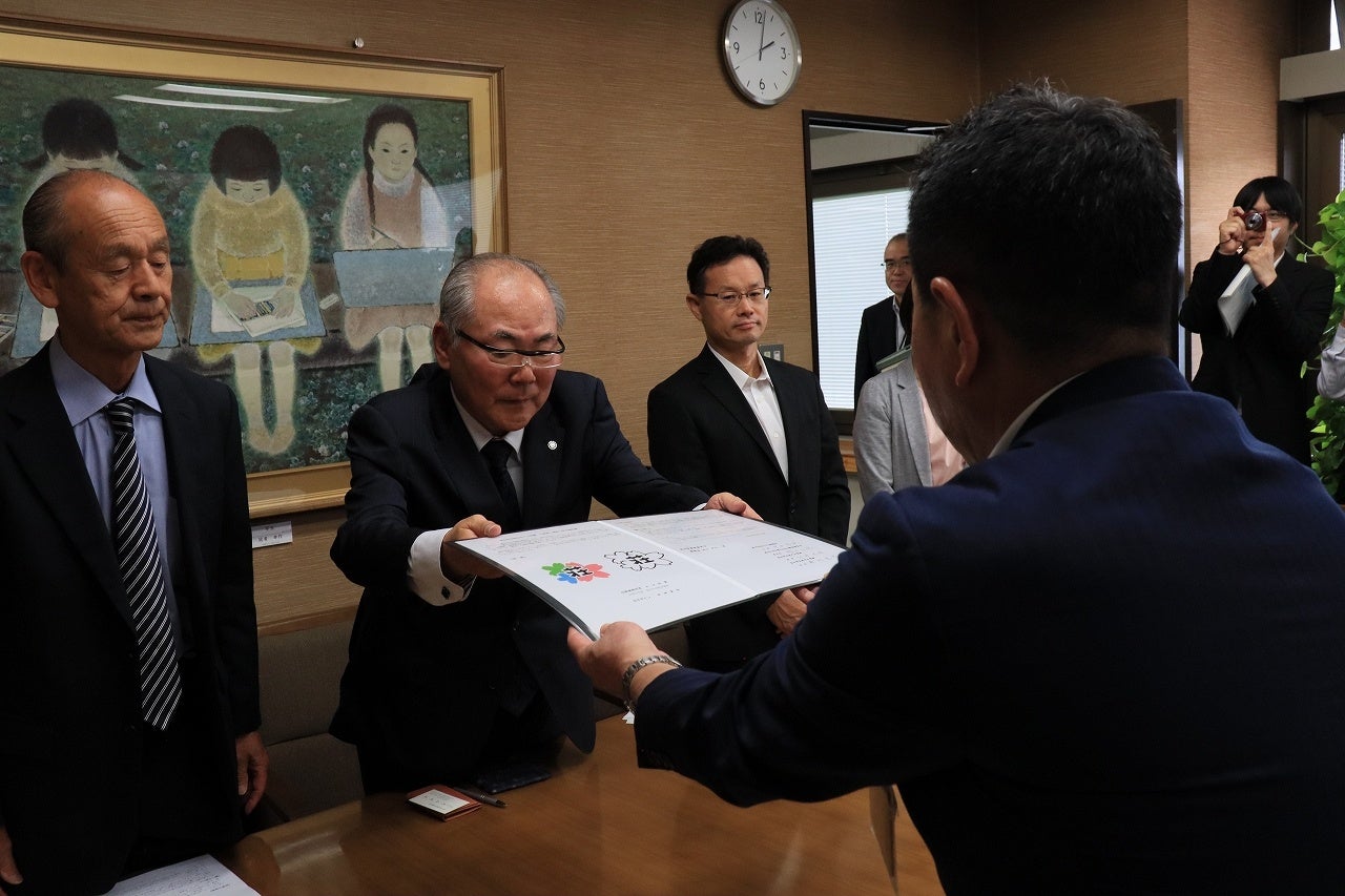令和7年度に開校を予定している「高山市立荘川さくら学園」の校章が決定し、令和6年6月18日(火)に、地域住民や保護者でつくる「荘川の子を育むための検討委員会」から見山政克教育長へ、校章デザインの選考や決定に至るまでの経緯の報告がありました。