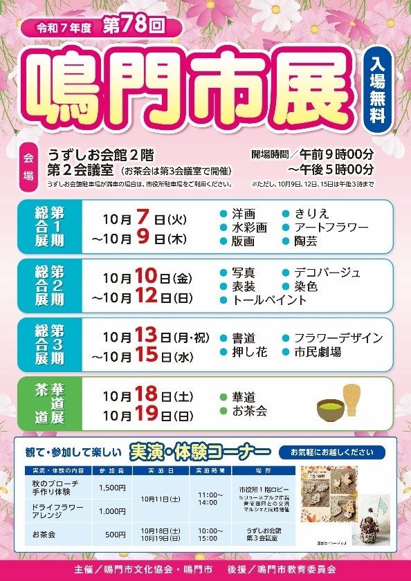 鳴門市民の皆さんから応募のあった作品(絵画・写真・書道・華道など)と鳴門市民劇場の活動紹介パネルの展示、お茶会を開催します。