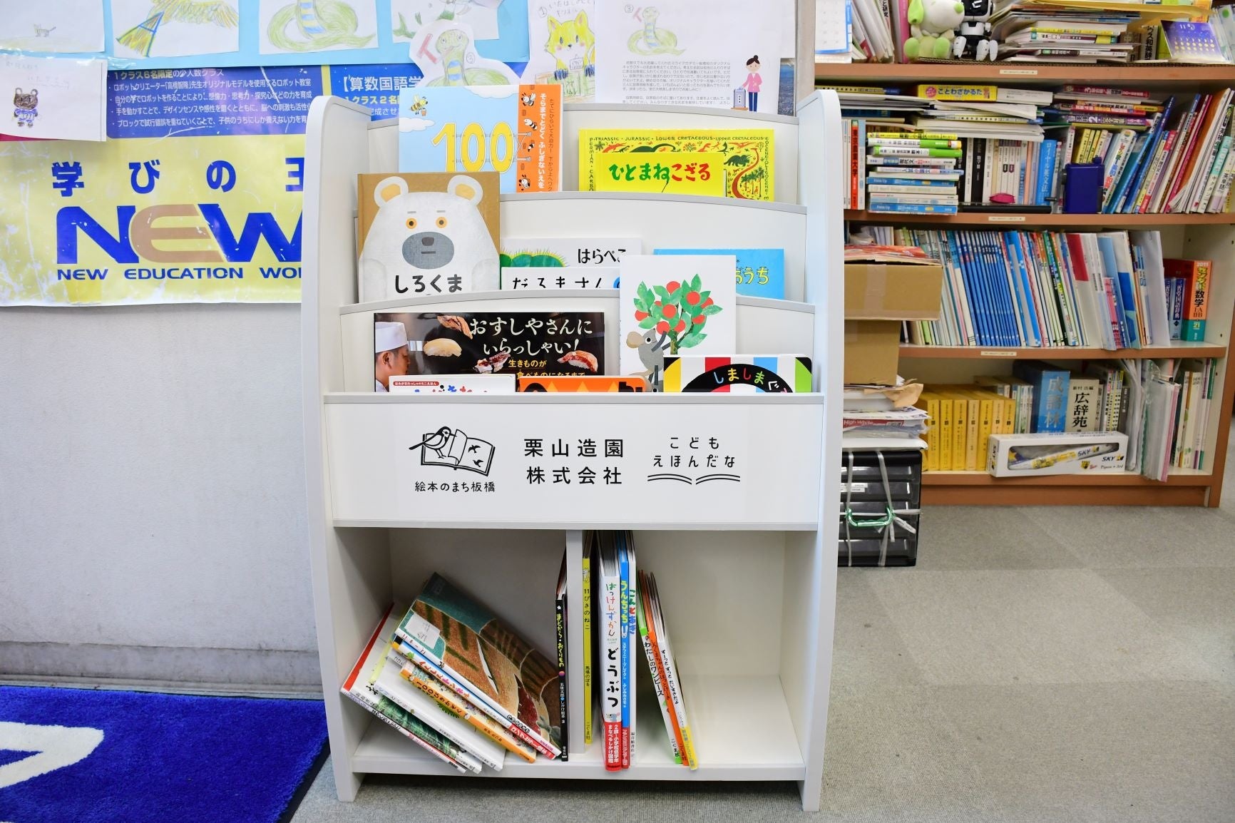 寄贈された絵本棚には、「絵本のまち板橋」「こどもえほんだな」ロゴ及び寄贈者である栗山造園(株)のロゴが入っており、板橋区で製本されている絵本30冊が置かれています。