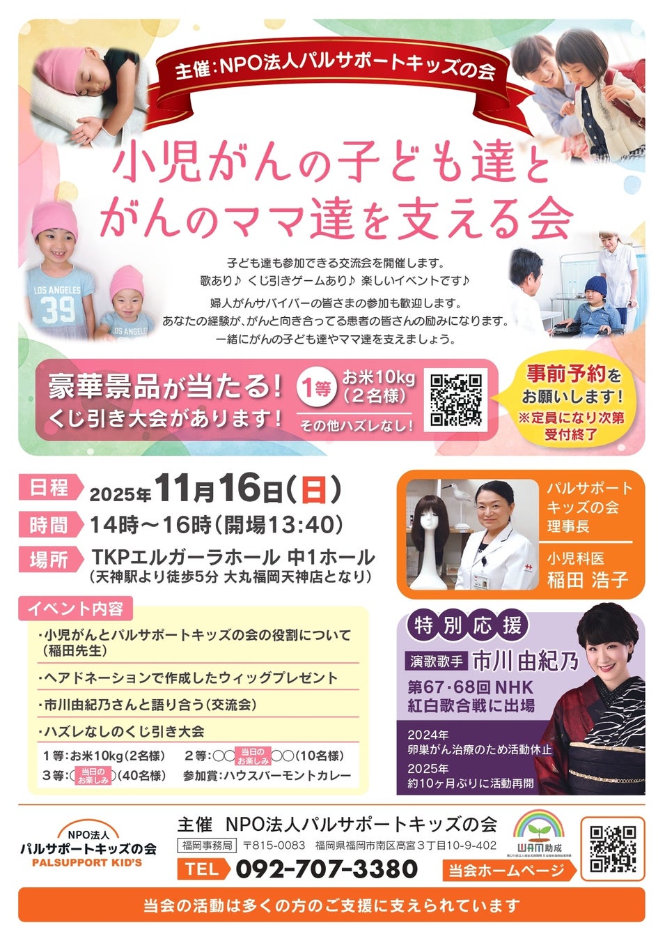 NPO法人パルサポートキッズの会(本店所在地:佐賀県唐津市、理事長:稲田 浩子)は小児がんの子ども達が参加できる交流イベント「小児がんの子ども達とがんのママ達を支える会」を11/16(日) 14:00~16:00に開催します(広報サポート:株式会社Asian Bridge)。