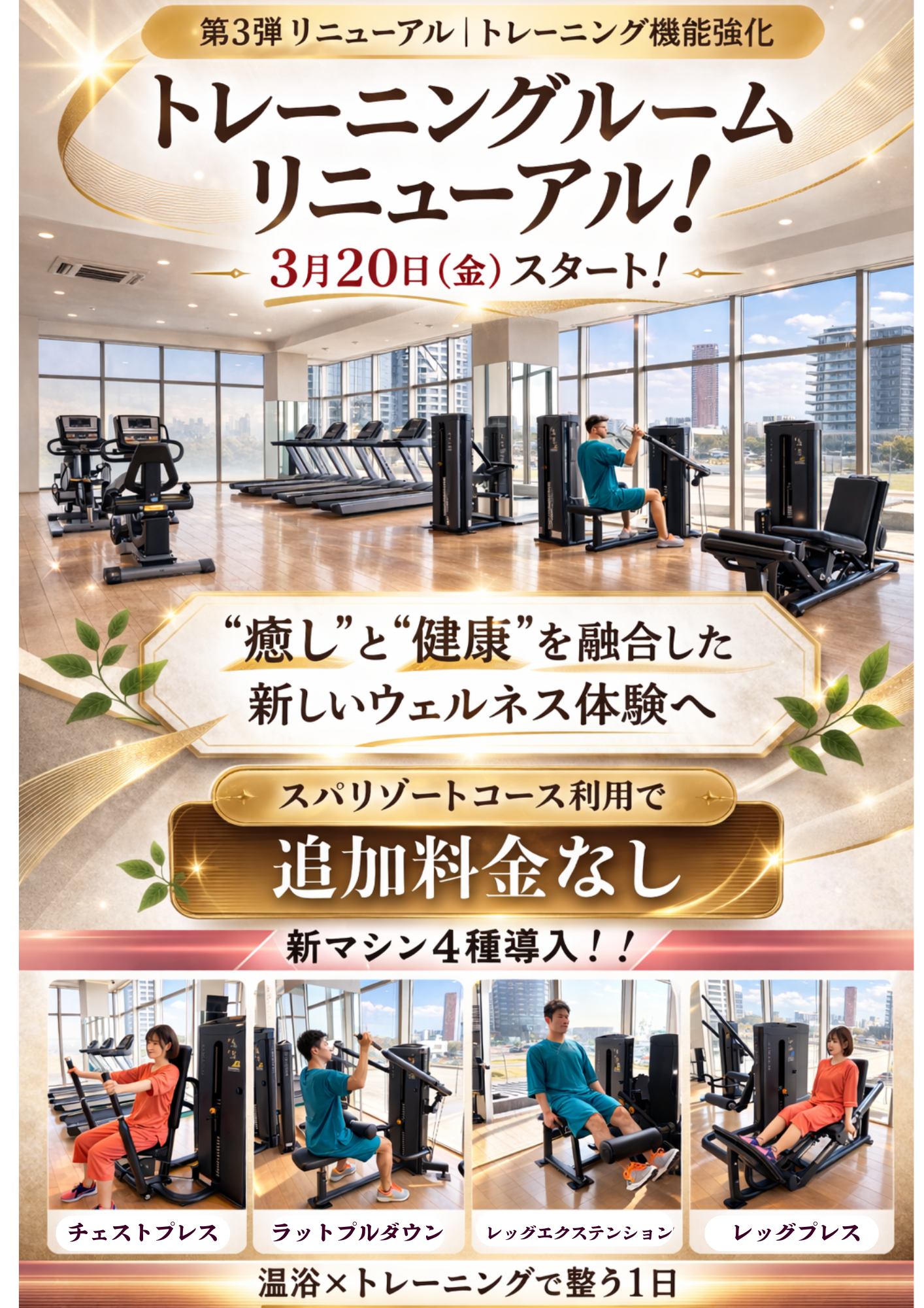 本リニューアルでは、上半身から下半身までバランスよく鍛えられる4種のトレーニングマシンを新たに導入。スパリゾートコースをご利用のお客様は、追加料金なしでご利用いただけます。