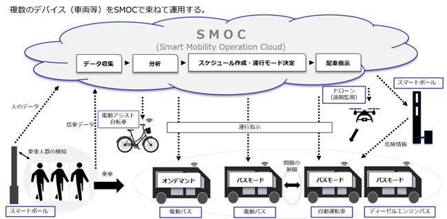 13台の電動バス(内1台は自動運転)と5台のクリーンディーゼルエンジンバスの位置情報や乗降客数などのデータに加えて、スマートポールやドローンからのデータをクラウドに蓄積します。これらの蓄積されたデータをもとに移動需要を分析し、最適な運行スケジュールを自動生成し、効果的で無駄のない運行の実現を実証します。