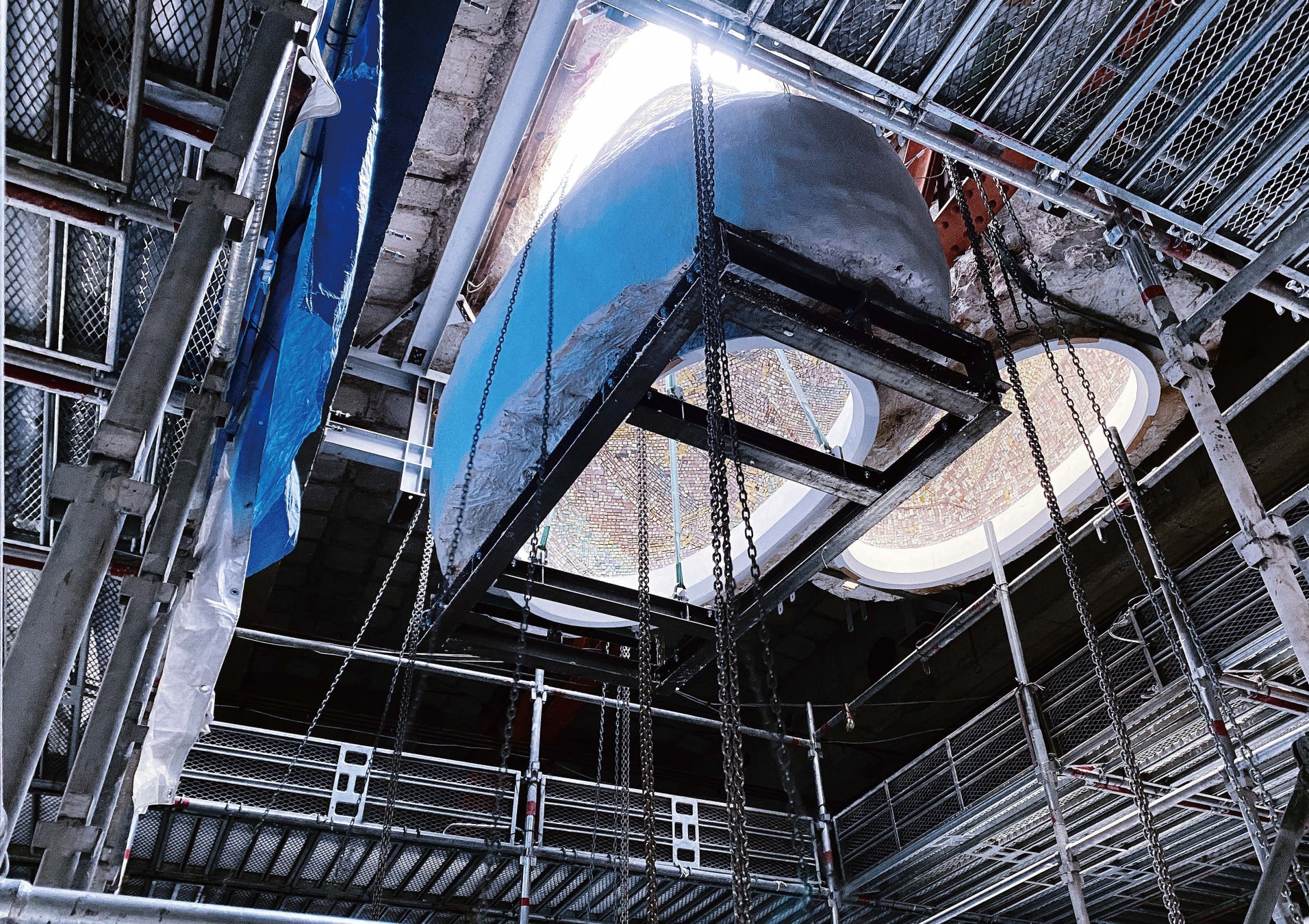 天井全体の構造的な耐震性能を確保するため、吊り天井を固定天井にする改修工事を行い、耐震補強後の天井に、モザイクタイルで装飾されたトップライトが差し込む重量のある石膏ドームを収めるリノベーションマニュアルでした。マニュアルもなく、難解な工事のため設計の入札はビーファクトリー1社のみ。長年の知見と技術によって、令和3年、完成に至ることができました。