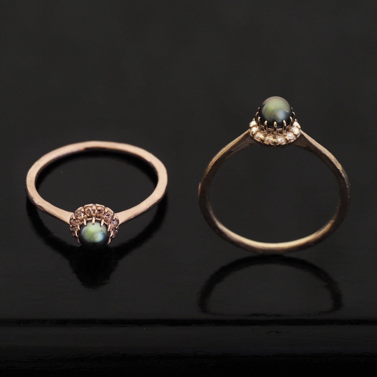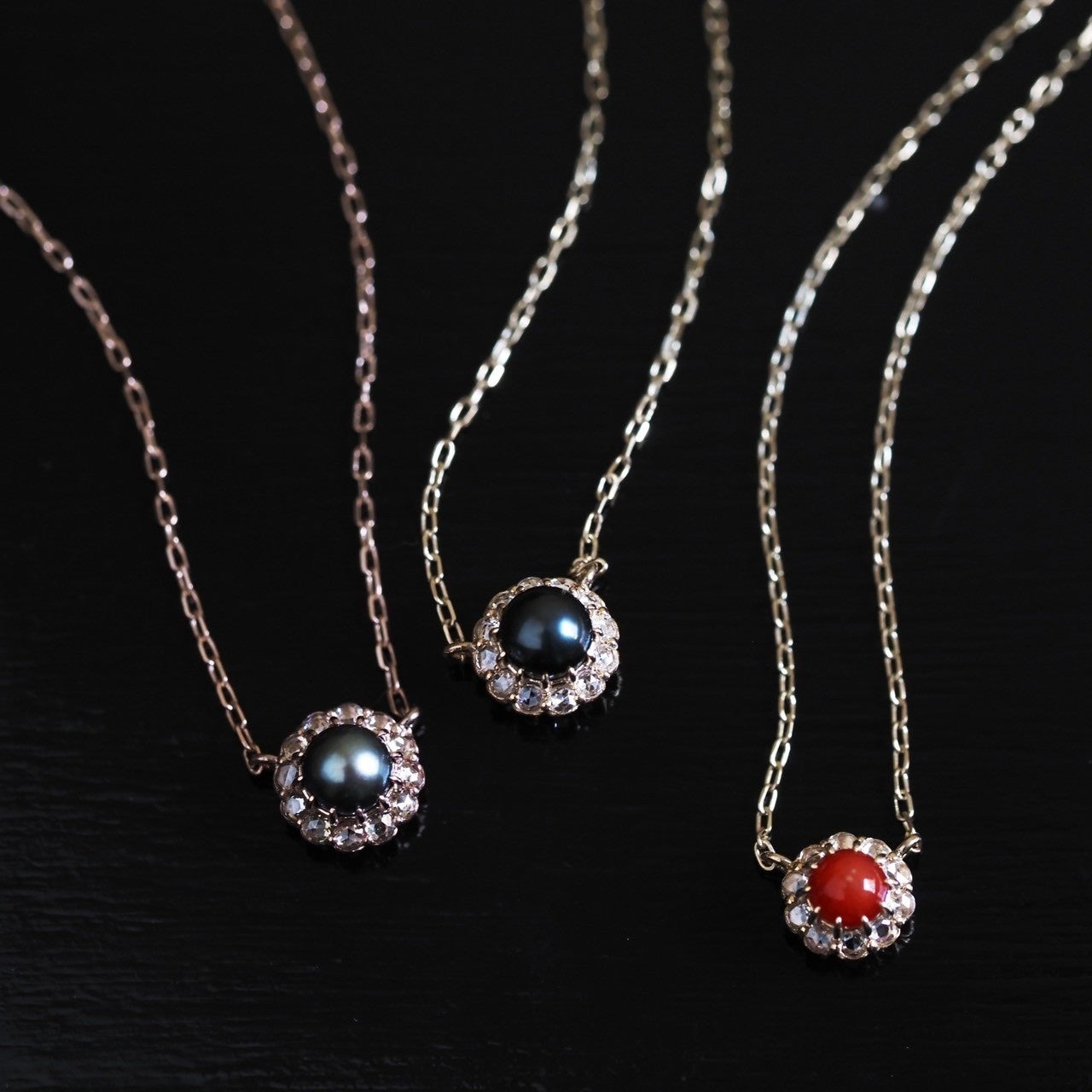 それぞれが持つ独特の色合いと光沢が際立つように、極小のメレストーンで繊細に取り巻きました。