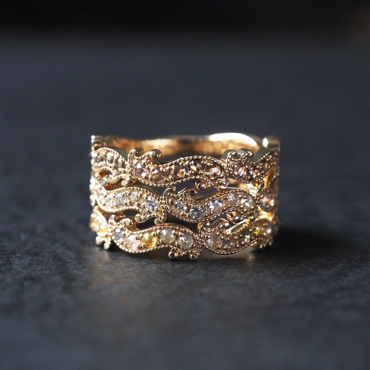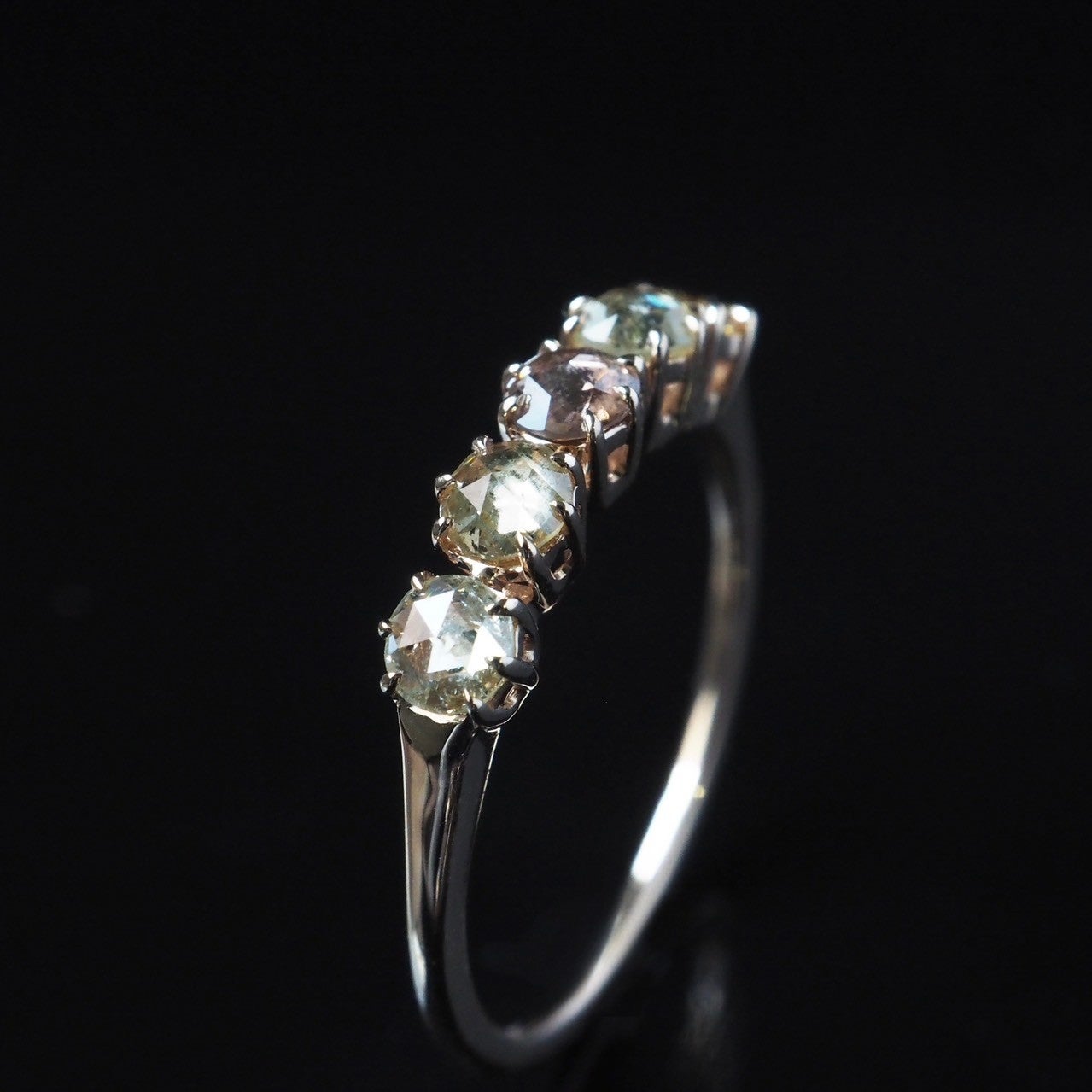 通常より0.5mm小さい3.5mmサイズのローズカットダイヤモンドをセットした『ポム』リング。小ぶりなサイズ感が指に馴染み、より愛らしい佇まいに仕上がりました。ローズカットならではの潤んだ輝きと、ナチュラルなカラーバリエーションが魅力のリングです。