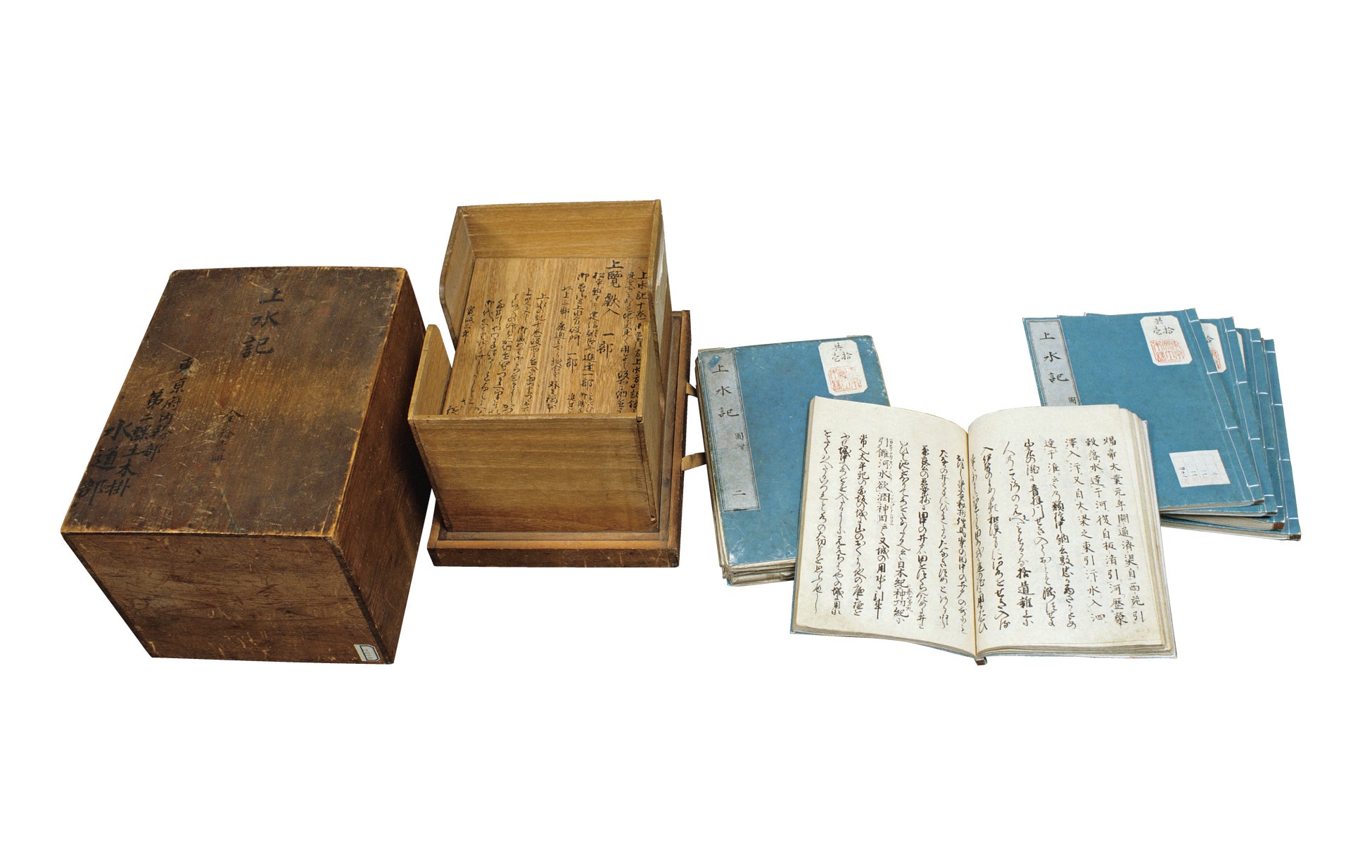 『上水記』は、寛政3年(1791)に完成した江戸時代の水道(上水)の記録です。3部作られましたが、全10巻が全て揃った状態で現存するものは当館所蔵品のみで、東京都指定有形文化財(古文書)に指定されています。なかでも第二巻の「玉川上水水元絵図并諸枠図」は、現在も多摩川の同じ場所にある「羽村取水堰」の江戸時代当時の様子を縦135.5cm×横514cmの大紙面に精緻かつ鮮やかに描いたもので、一見の価値があります。