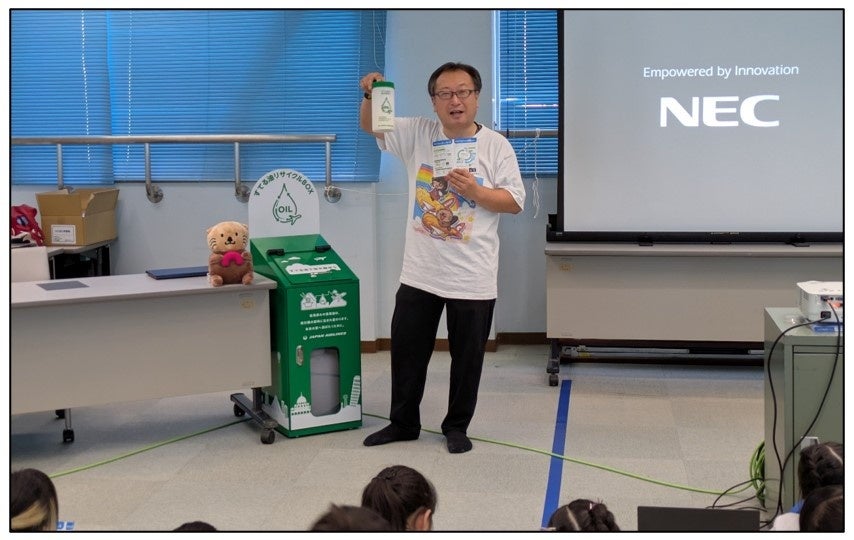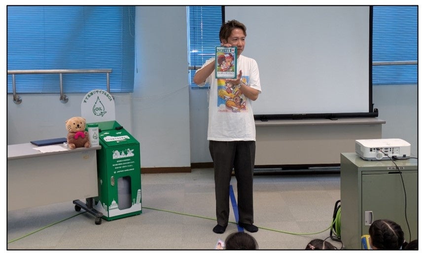 日本航空(JAL)と連携して、お客様のご家庭から出る廃食油(使用済みの油)を店頭で回収して、『SAF(持続可能な航空燃料)』にリサイクルする取り組みについて、専用の回収ボトルや回収 ボックスの実物を用いて、回収(=リサイクル)できる油・できない油やCO₂の削減効果等、わかりやすく学べる授業を実施