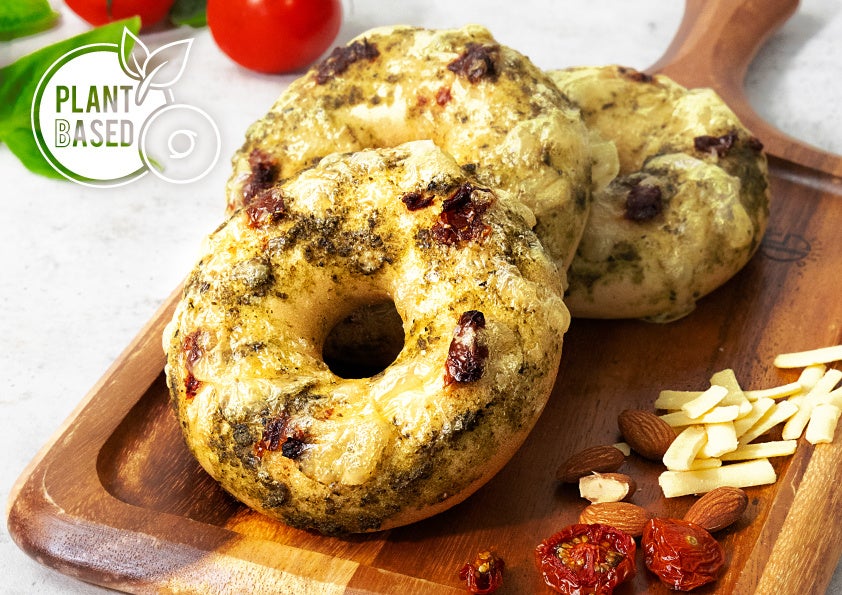 しっとりもちもちのプレーンベーグルにプラントベースチーズをたっぷりトッピング。香り豊かなバジルペーストと旨味凝縮のドライトマトを合わせました。カラダに優しく、満足感のあるヘルシーベーグルです。