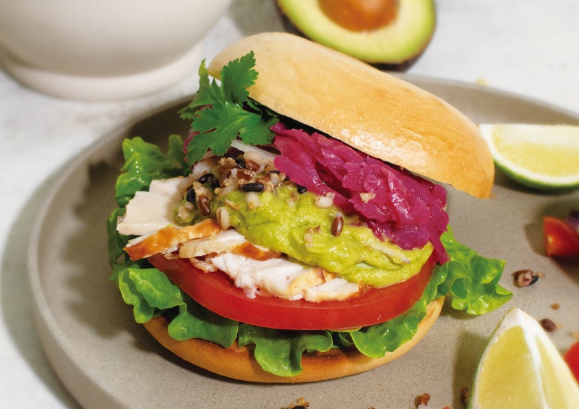メキシコのソウルフード「ワカモレ(アボガドディップ)」やヘルシーなグリルブレストチキン、フレッシュ野菜をたっぷり挟み、南米のスーパーフード「キヌア」をトッピングした、暑い夏にぴったりなメキシカンベーグルサンドイッチです。