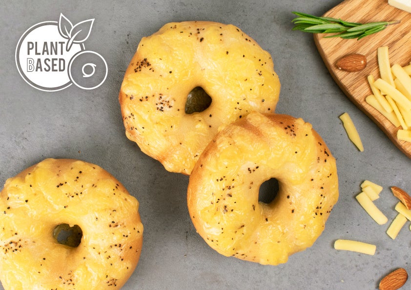 しっとりもちもちのプレーンベーグルに、チーズ好きのための植物性チーズ「プラントベースチーズ」とブラックペッパーをトッピングした、カラダに優しいベーグルです。