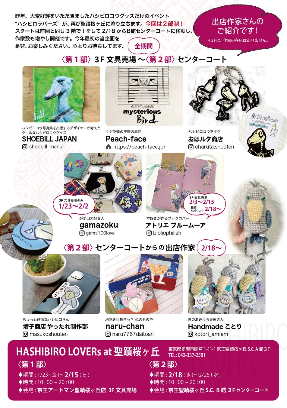 昨年大好評頂きましたハシビロコウを愛してやまないクリエーターによるハシビロコウ作品だけを集めたイベント「HASHIBIRO LOVERs at 聖蹟桜ヶ丘」が今年もやってきます!