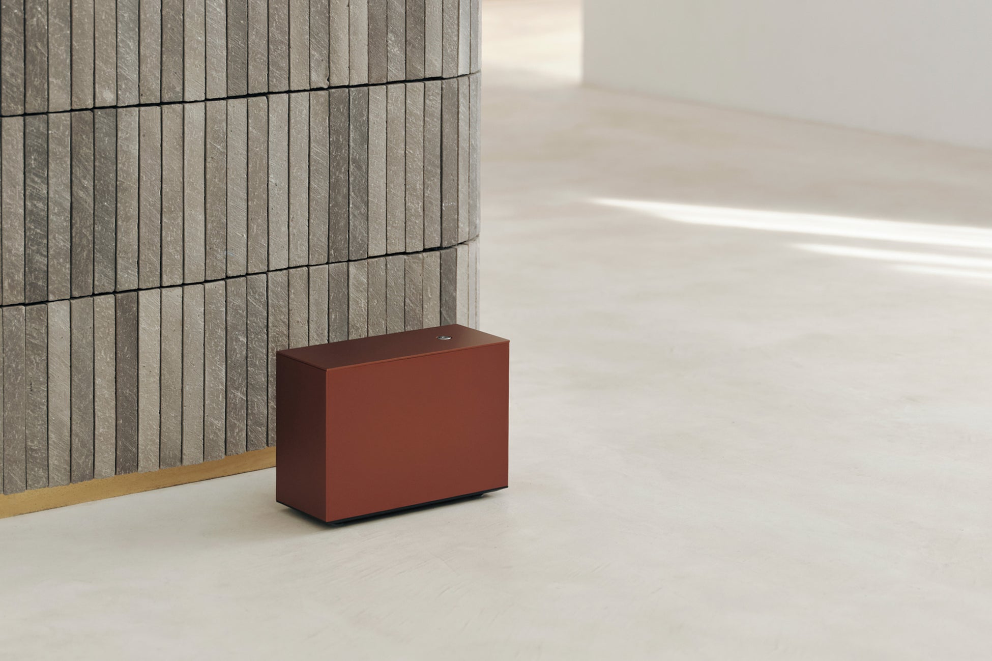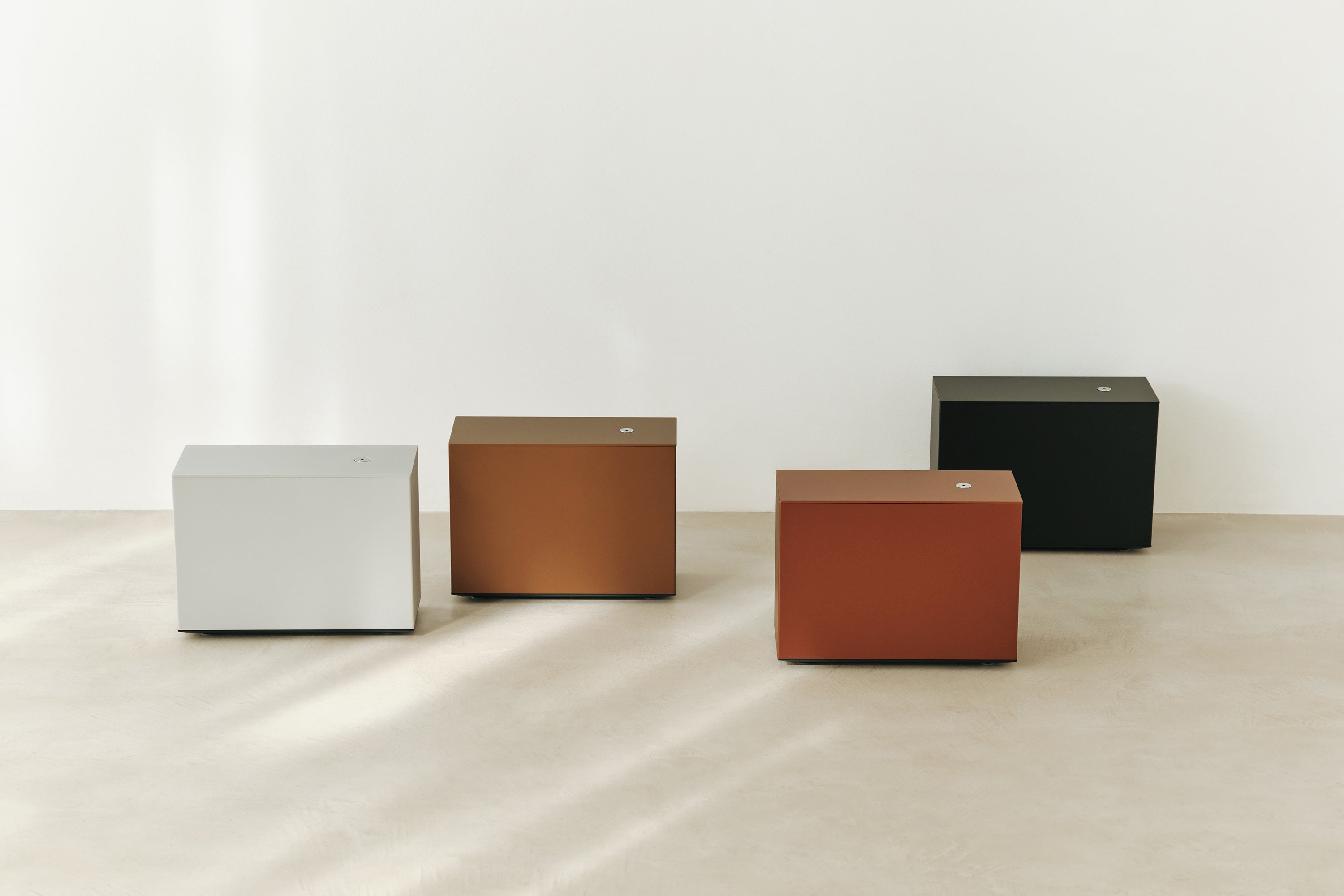 プロダクトデザイナー柴田文江氏による、シンプルで丁寧なデザインです。金属の重厚感に軽やかなフットデザインを組み合わせ、ミニマルでありながら精緻な造形を実現しました。カラーは、あらゆる空間に調和する洗練された4色展開。ボトルキャップを置ける構造をはじめ、内部の見えない部分にまで配慮し、デザイン性と実用性を両立しています。