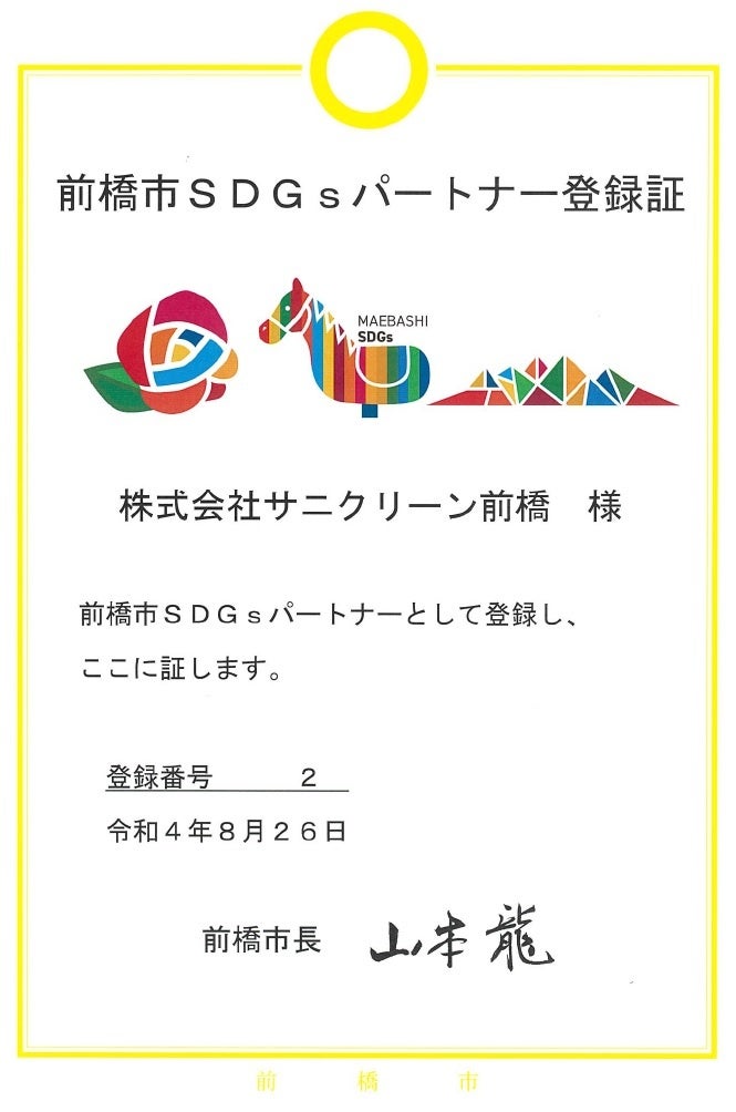 サニクリーン前橋が「前橋市SDGsパートナー」企業に登録されました