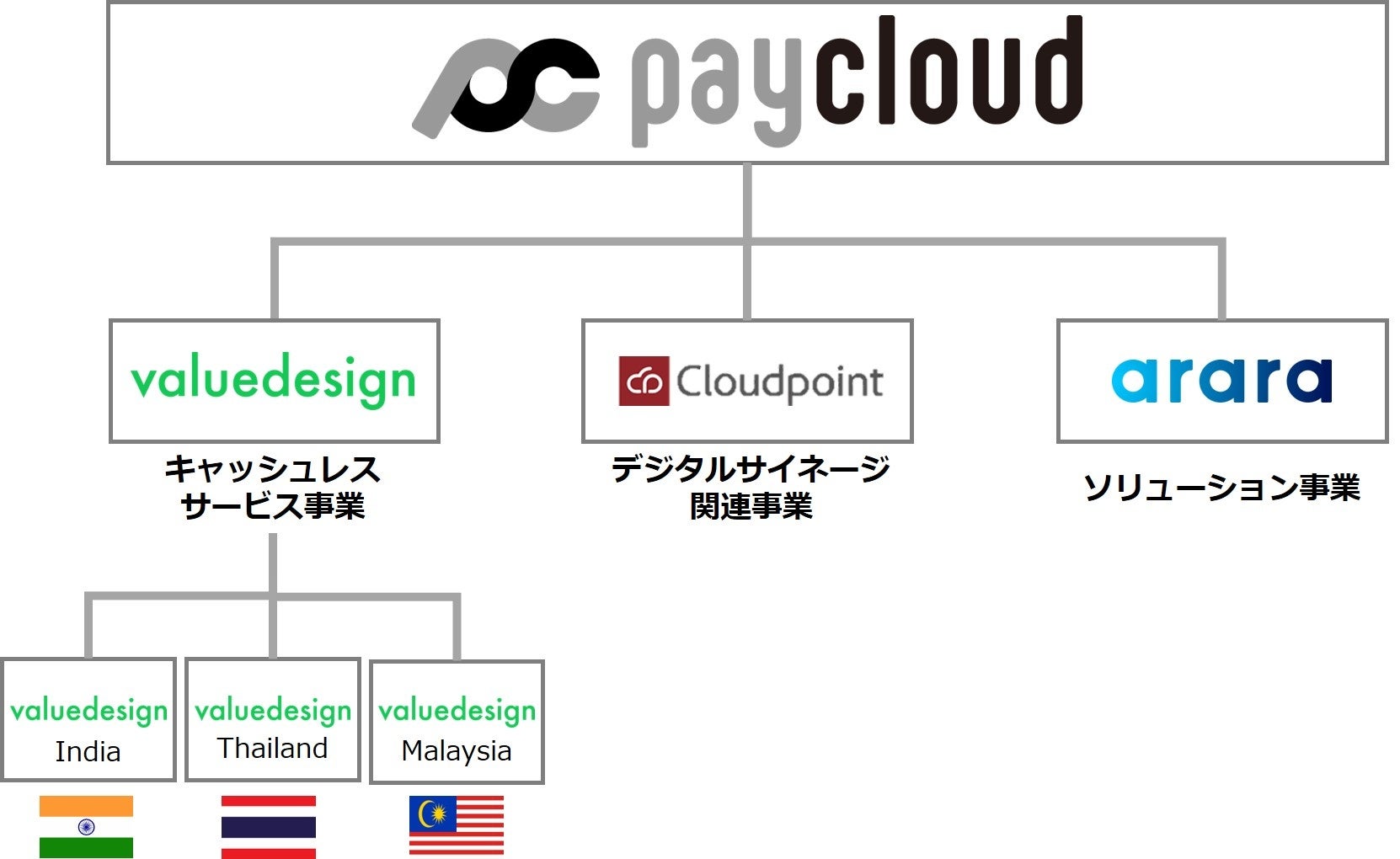 ペイクラウドホールディングス株式会社(本社:東京都港区、代表取締役社長:尾上 徹)(注)は、メール配信サービスをはじめソリューション事業をおこなうアララ株式会社(新設。本社:東京都港区、代表取締役社長:門倉 紀明)、キャッシュレスサービス事業を展開する株式会社バリューデザイン(本社:東京都中央区、代表取締役社長:林 秀治)、デジタルサイネージ関連事業を手掛けるクラウドポイントの3社をグループ会社として構成しています。今後はペイクラウドグループとして、各社の事業シナジーを最大化すると同時に、相互のグローバルな事業展開を模索してまいります。