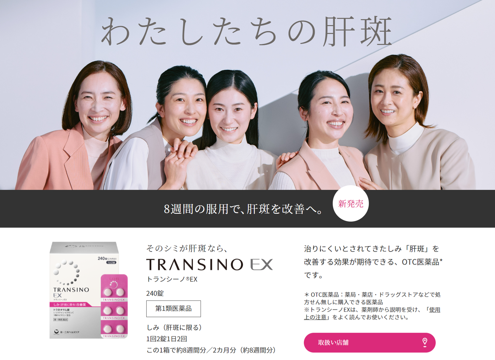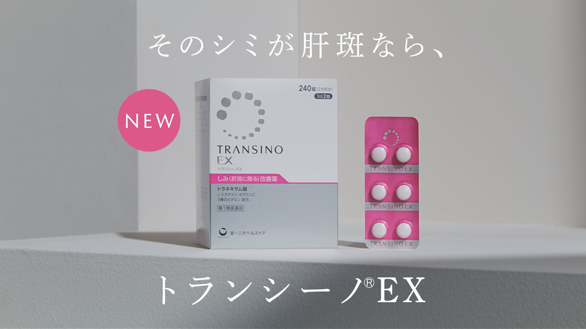 「トランシーノ」は、しみの一種である「肝斑」の効能・効果が認められた日本初*1のOTC医薬品として、2007年に誕生しました。2024年春、有効成分「ニコチン酸アミド」を追加配合した、初代発売以来初の処方強化品*2「トランシーノEX」を新発売します。