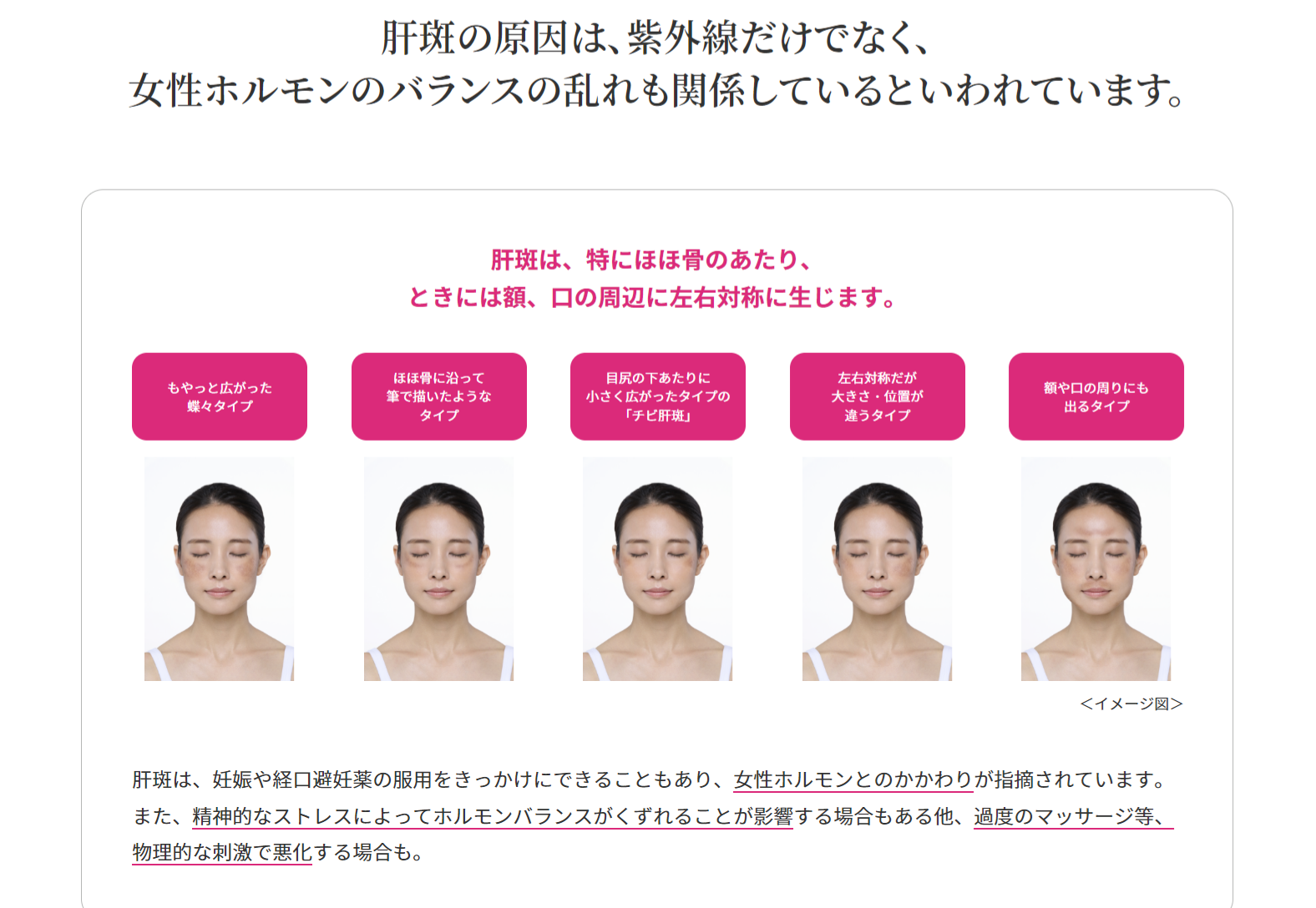 『わたしたちの肝斑』特設サイトでは、肝斑の具体的な症例や原因、改善・予防方法などを解説しています。主に、ほほ骨または目尻の下あたりに左右対称にあるしみは肝斑である可能性が高く、原因は紫外線だけでなく、女性ホルモンのバランスの乱れも関係していると言われています。また、しみ悩みを経験している20~50代女性のうち、約2人に1人(55%)が肝斑の可能性があるという調査結果*が出ています。こうした背景も踏まえ、正しい知識を広めるため、Webムービーの公開および特設サイト開設に至りました。