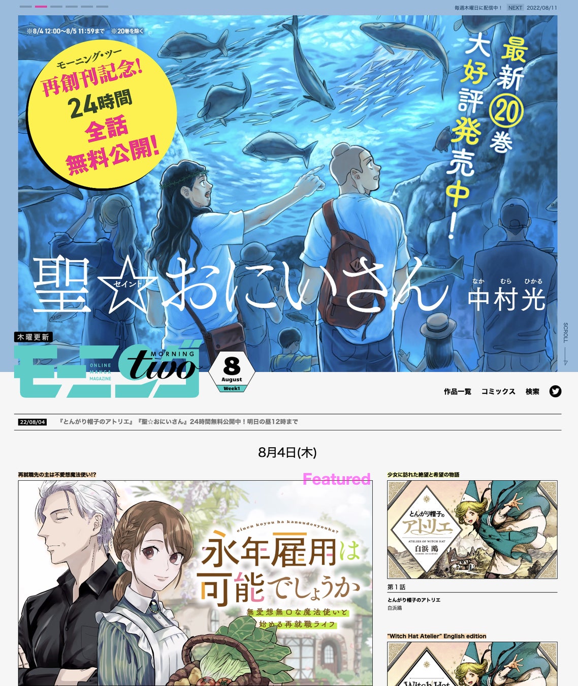 「モーニング・ツー」は、2006年に講談社が創刊したマンガ雑誌「月刊モーニング・ツー」のWebマンガサイトです。月刊誌から「週刊モーニング」と同様の木曜日更新のWebマンガサイトに舞台を移し、魅力あふれる作品群を世界に発信します。