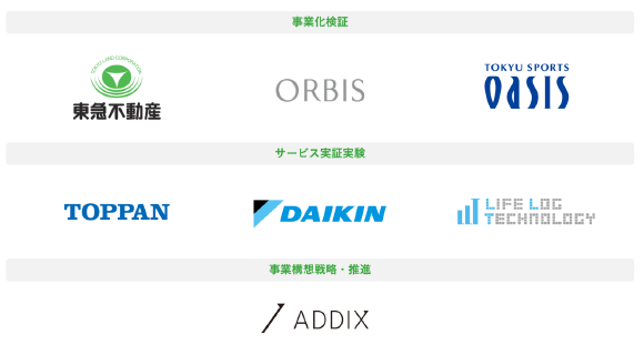 本事業は、ビューティーブランドを展開するオルビス株式会社(以下、「オルビス 」)、東急不動産ホールディングスグループでフィットネスクラブを展開する株式会社東急スポーツオアシス(以下、「東急スポーツオアシス」)と共にサービス提供を行うことを目指しており、サービス拡大に向けては、ダイキン工業株式会社、凸版印刷株式会社、ライフログテクノロジー株式会社(五十音順)をサービス実証実験協力企業に迎え 実証実験を行います。また、 本事業の事業構想戦略・推進パートナーとして株式会社 ADDIXを迎えて事業化に向けた検討を進めてまいります。