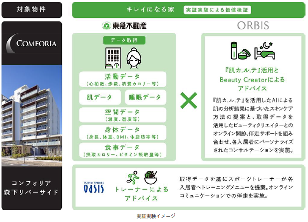 2023年1月より、実証実験の第1弾として、当社が開発した「コンフォリア森下リバーサイド」を対象に、IoTデバイスを用いて住環境や住生活から取得できる約40種のデータの取得を開始します。取得した住まいのデータを活用し、オルビス、東急スポーツオアシスと共に、美容・運動に関する最適なアドバイスやコンテンツ提供などから キレイになるサポートをいたします。