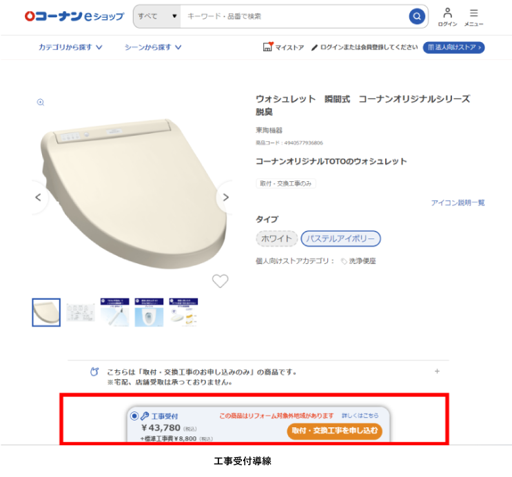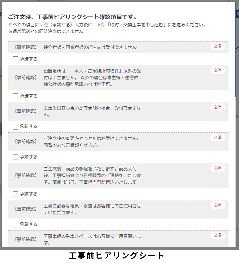 設置工事が必要な商品に関しては、購入カート導線が『取付・交換工事を申し込む』という導線に変わりクリックをすることで、必要な確認項目が表示され商品購入と工事申し込みが同時にできます。