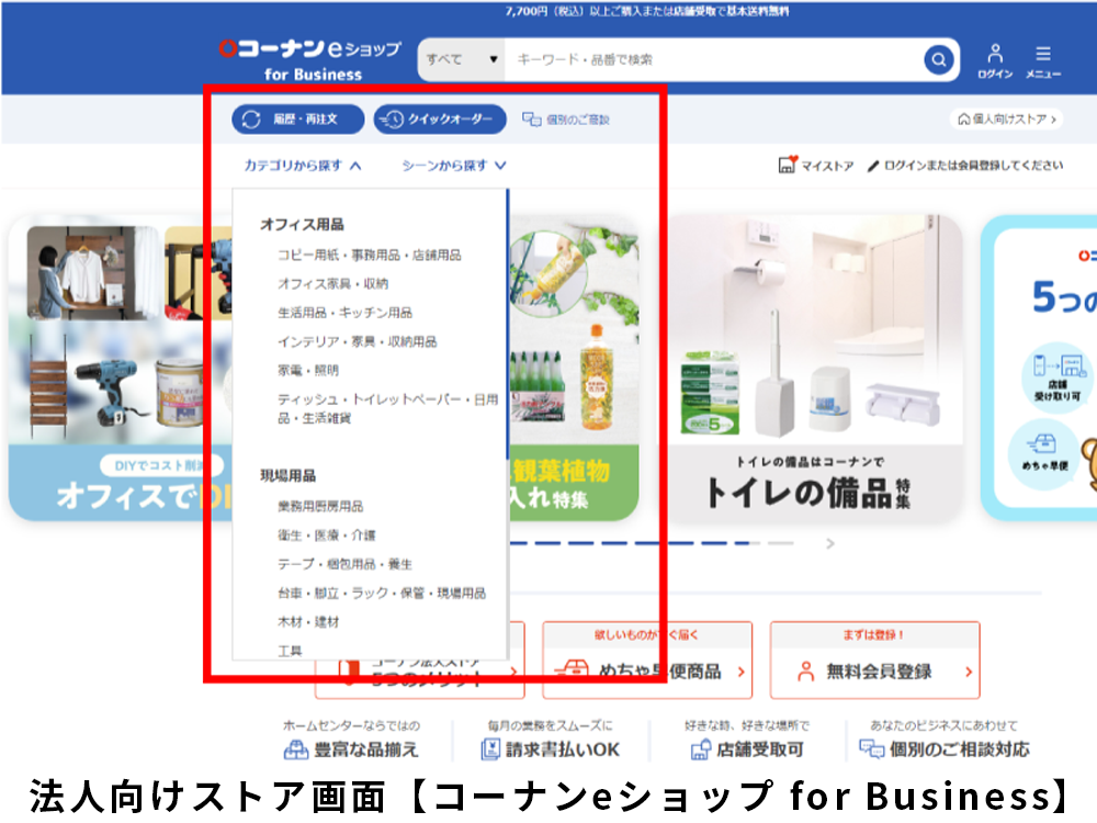 共通ヘッダーには『履歴・再注文』『クイックオーダー』『個別のご商談』などの法人の顧客が利用しやすい導線だけではなく、『カテゴリから探す』が「オフィス用品」や「現場用品」など法人の顧客に特化した分類に分けられ、法人の顧客もストレスなく商品を探すことができるようになりました。