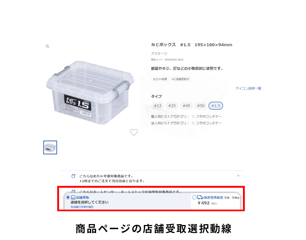 これにより例えば大工等の職人が、現場に行く途中で店舗に立ち寄り商品を受け取りながら、他の現場で使用する商品を直接現場に配送することができるなど、ただ店舗で商品を受け取ることができるだけではなく、お客様自身が状況に合わせて柔軟に買い物をすることができる環境を実現しました。
