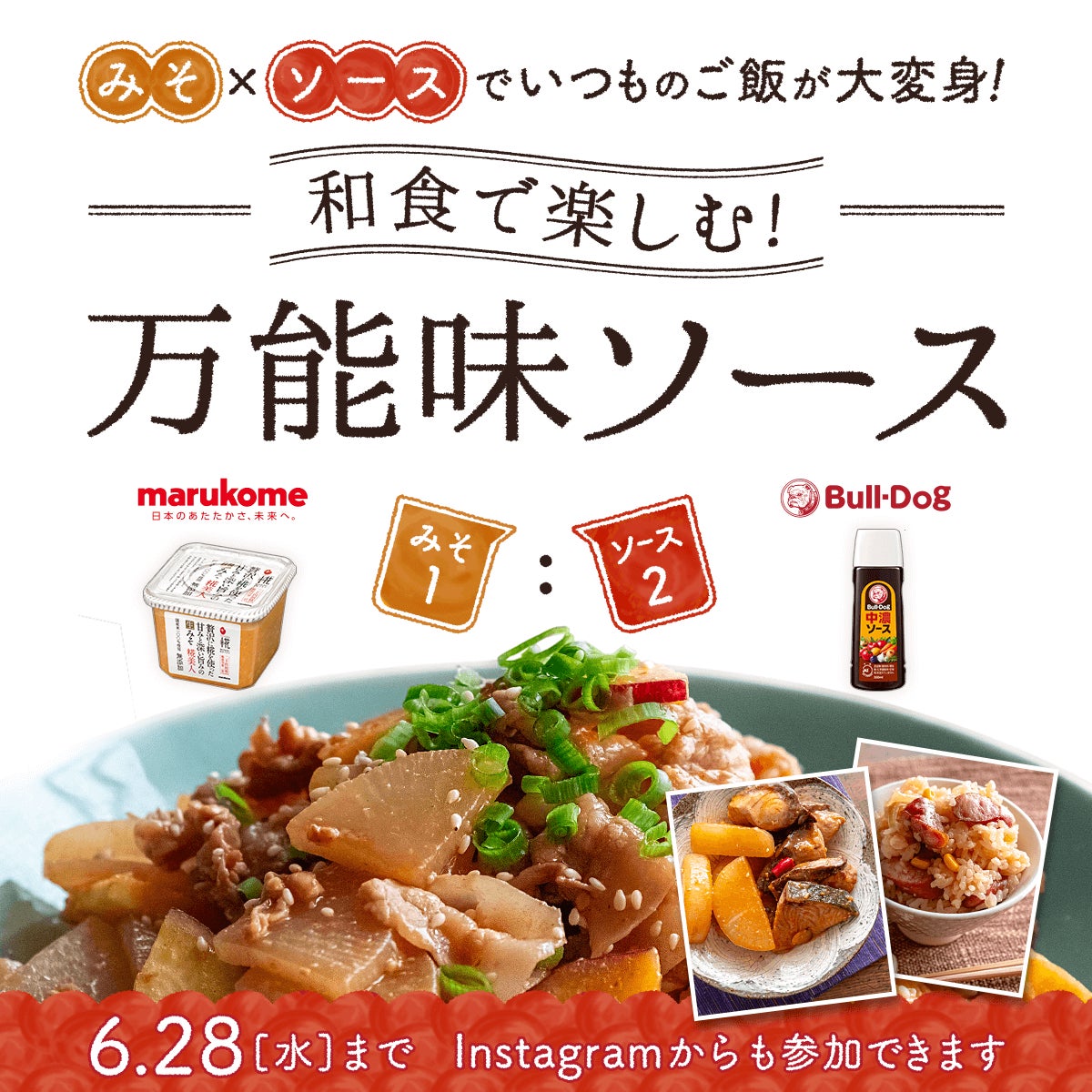2021年より当社とマルコメ株式会社、ブルドックソース株式会社は、みそと中濃ソースを1:2の配合で混ぜて使う「万能味ソース」を家庭で体験してもらう取り組みを行っています。コロナ禍での料理のマンネリ化の悩みを解消する万能調味料として、どこの家庭の冷蔵庫にもある、みそと中濃ソースで作る「万能味ソース」の食卓での体験作りと、実際に使っている方からまわりへのおすすめの輪を拡げる料理投稿企画の場を提供してきました。