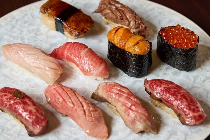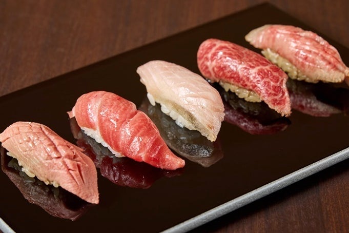 “飛騨牛のタン芯握り”をはじめとする極上の牛肉寿司と“和牛ユッケと北海道産雲丹の雲丹ドッグ”など最高級和牛と旬の海鮮で四季を感じる牛肉寿司が全30種類。お料理と共に“音”、“香”、“美”を五感でお楽しみいただけます。