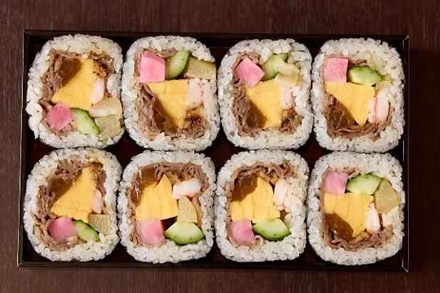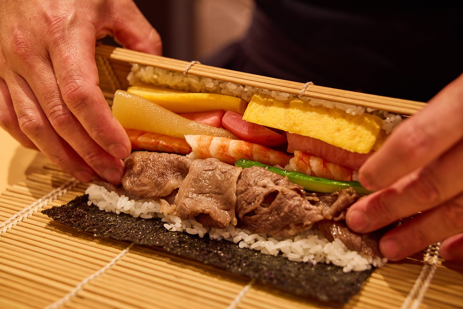 A5仙台牛ロースと海老、数の子、煮穴子など8種の具材がたっぷり入った太巻きです。シャリは国産米2種をブレンドし、さっぱりとした米酢とりんご酢で仕上げました。