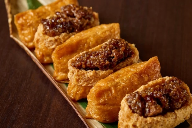 和牛ホルモンのコプチャンとイカげそを甘辛く炊いたジューシーないなり寿司と、牛軟骨のウルテとイカげその、コリコリ食感を楽しむ焼肉屋さんのいなり寿司です。