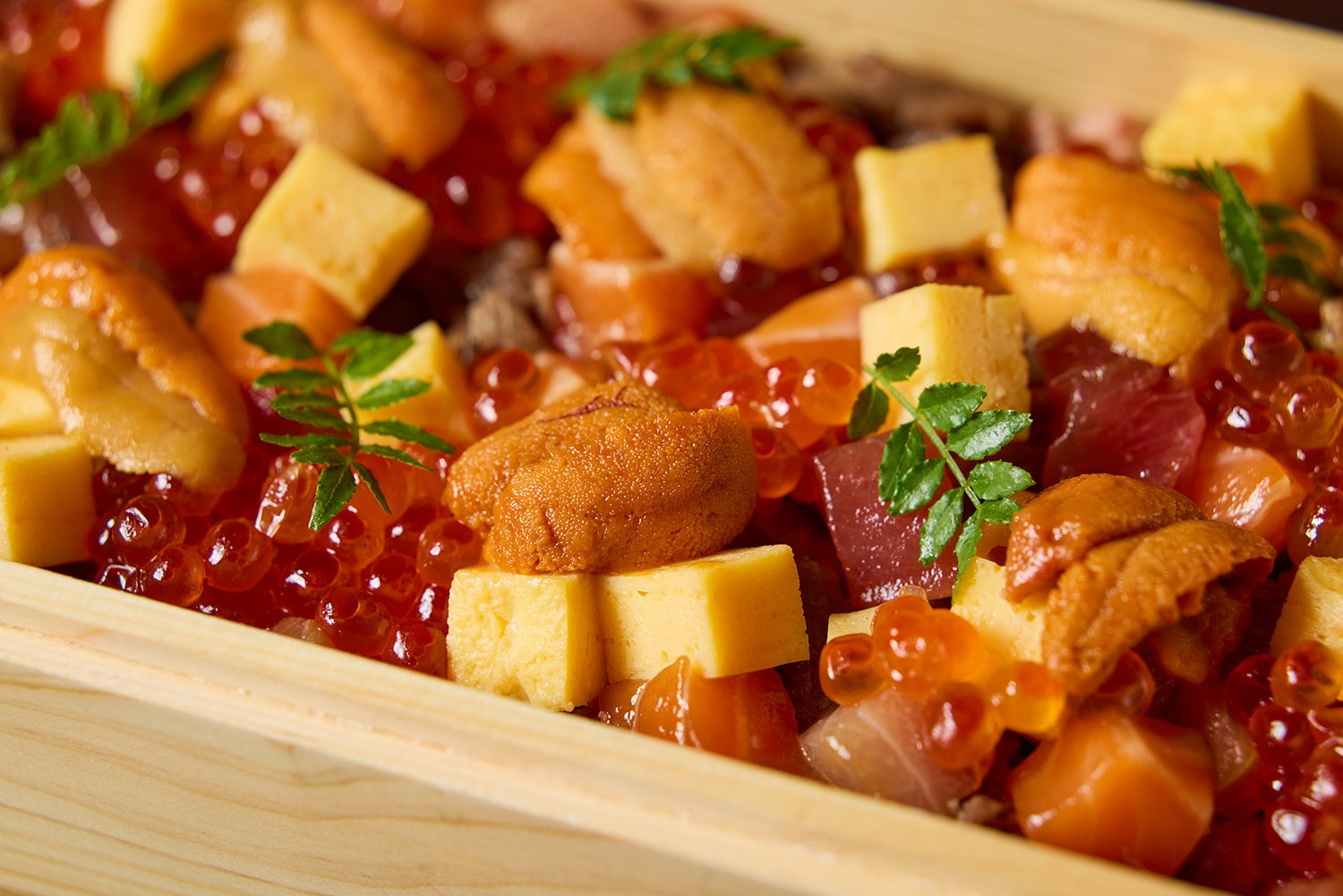 飛騨の牛ハラミ、牛タン、A5仙台牛とうがらし、仙台牛ロースの4種の牛肉と雲丹やまぐろなど5種の海鮮を贅沢にちらしました。