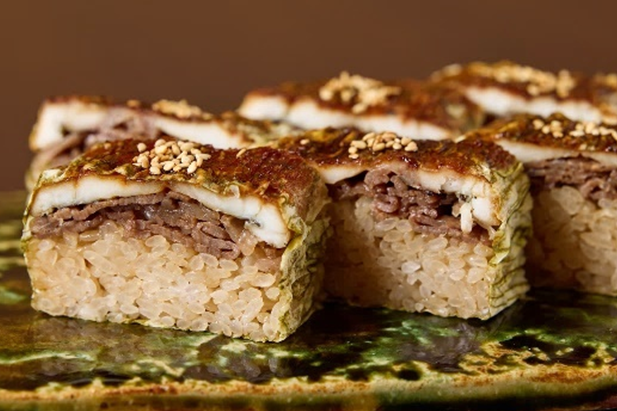 A5仙台牛ロースをすき焼きのタレで炊いて、旨味を凝縮し、煮穴子と合わせて押し寿司にしました。風味豊かなバルサミコ酢の黒シャリを使用しております。