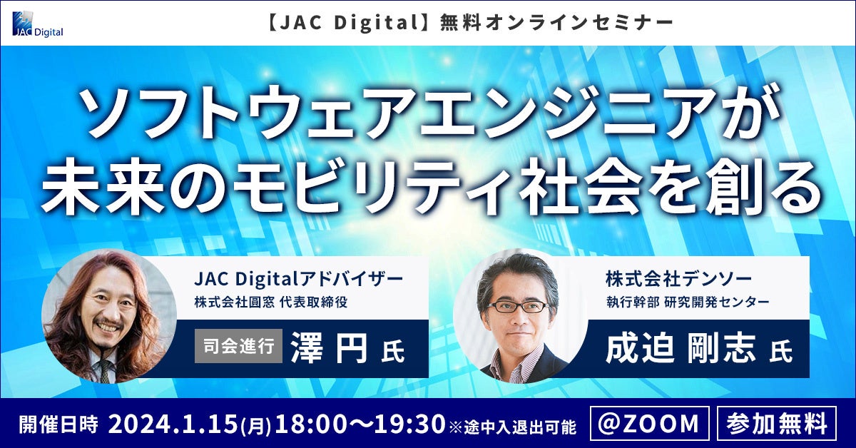 本セミナーでは、株式会社デンソー 執行幹部 研究開発センター 成迫 剛志氏にご登壇いただき、JAC Digitalアドバイザー澤 円氏が聞き手となって、これからのモビリティ業界を担うソフトウェアエンジニアへの期待についてお話しいただきます。