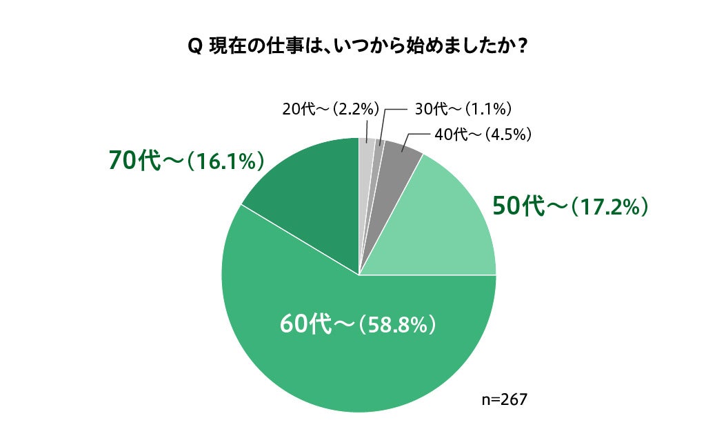 介護の仕事を始めた時期は「20代」が2.2%、「30代」が1.1%「40代」が4.5%、「50代」が17.2%、「60代」が58.8%、「70代」が16.1%と、60代以降から始めた人が全体の8割弱を占めました。シニア世代の新たなキャリアとして、介護職が選ばれていることが伺えます。