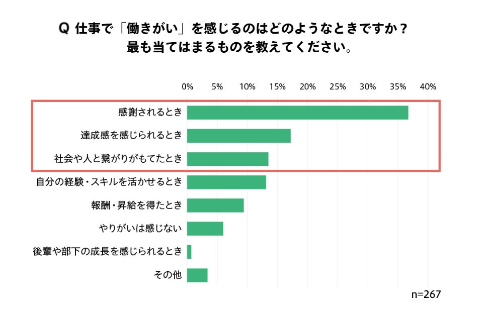 仕事をする理由として、「生計維持」が30.3%、「自由に使える収入を得る」が15.0%と、およそ半数が収入を目的とする一方、「生きがい・やりがい」が22.5%、「社会貢献」が11.2%、「健康維持」が10.5%、「人との繋がりをつくる」が10.1%と、半数以上が内発的動機によることが伺えました。さらに、「働きがい」を感じるときについては「感謝されるとき」が最も高く36.7%、次いで「達成感を感じられるとき」が17.2%、「社会や人と繋がりが持てたとき」が13.5%と続きました。仕事を通じた自己成長や周囲の人との繋がりを「働きがい」と感じている人が多いことがわかります。