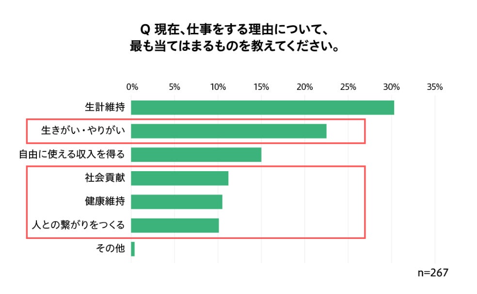 半数以上が仕事をする理由として「生きがい・やりがい」「社会貢献」「健康維持」「人との繋がり」等、内発的動機を選択