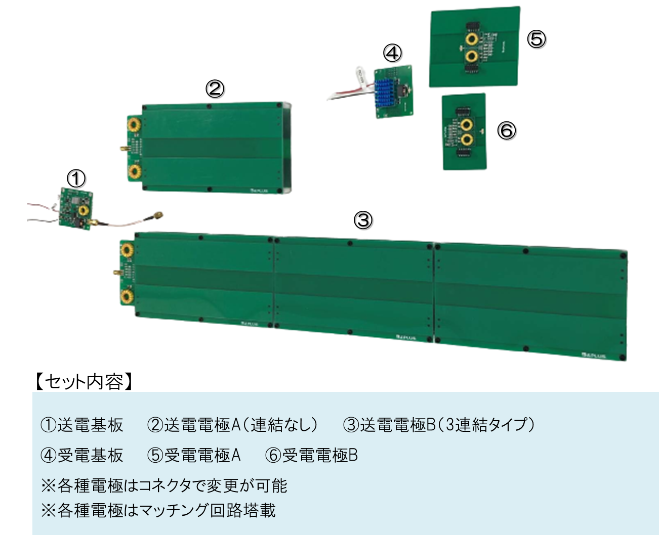 B&PLUSでは、磁界方式のワイヤレス給電以外に、電界結合方式やマイクロ波方式についても研究を進めております。今回、新たに開発した電界結合用標準基板を用いて『電界結合標準基板セット』を開発しました。セット内容には、①高周波電源(送電基板)、②,③マッチング回路含む送電電極×2種類(送電電極A、B)、④整流回路(受電基板)、⑤、⑥マッチング回路含む受電電極×2種が(受電電極A、B)含まれており、10W級の電界方式ワイヤレス給電を構築できるセットです。