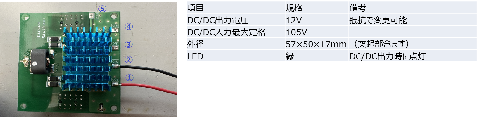 受電電極から流れる交流を直流へ変換して、DCDCコンバーターにより、12Vで出力します。