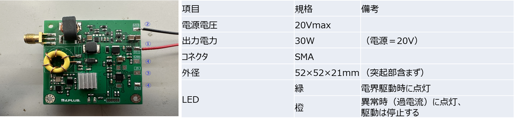 13.56MHz帯の高周波を発振させる為の送電基板です。通常、20Vを印可して使用します。
